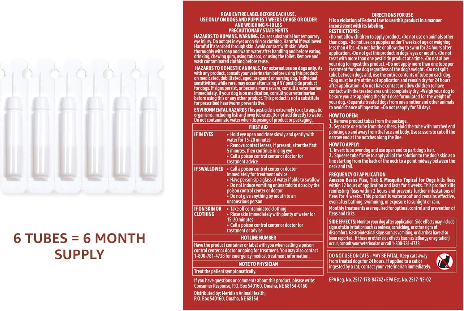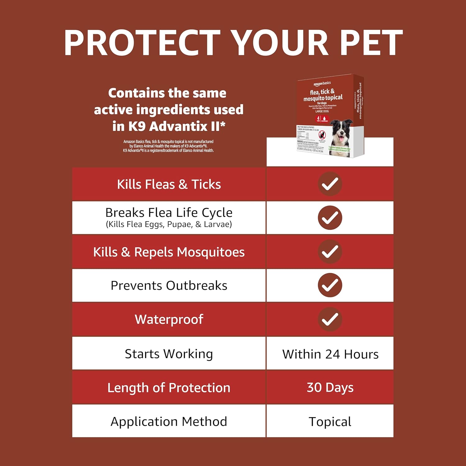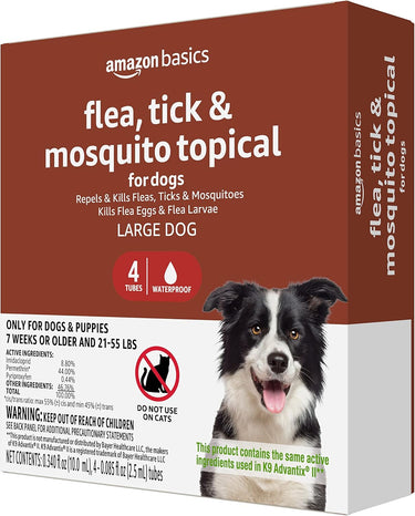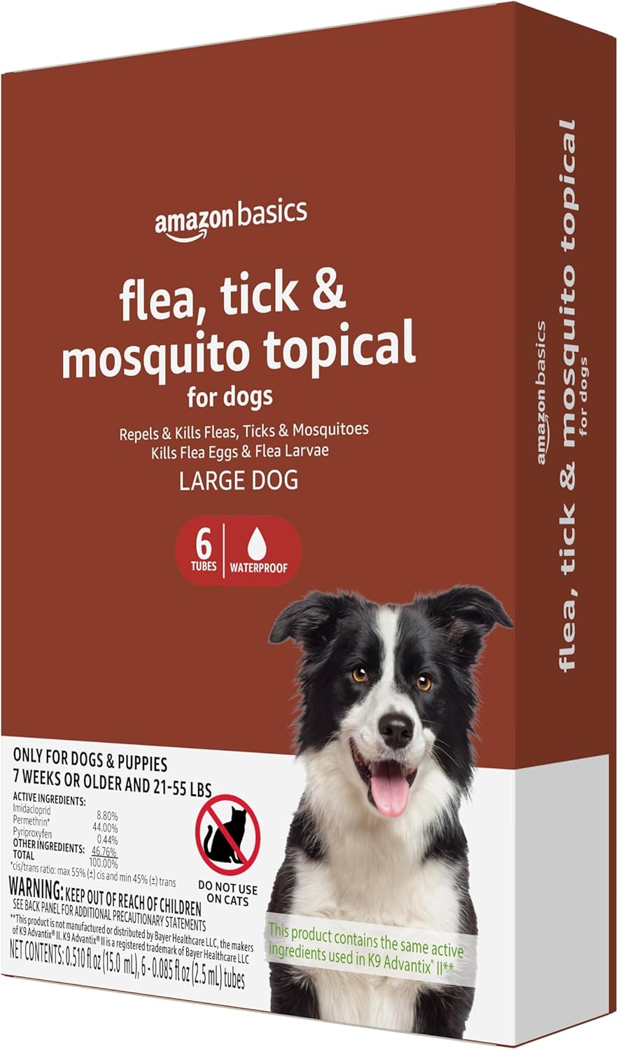 - One 6 dose pack of Amazon Basics Flea, Tick & Mosquito Topical for Large Dogs (21-55 pounds)