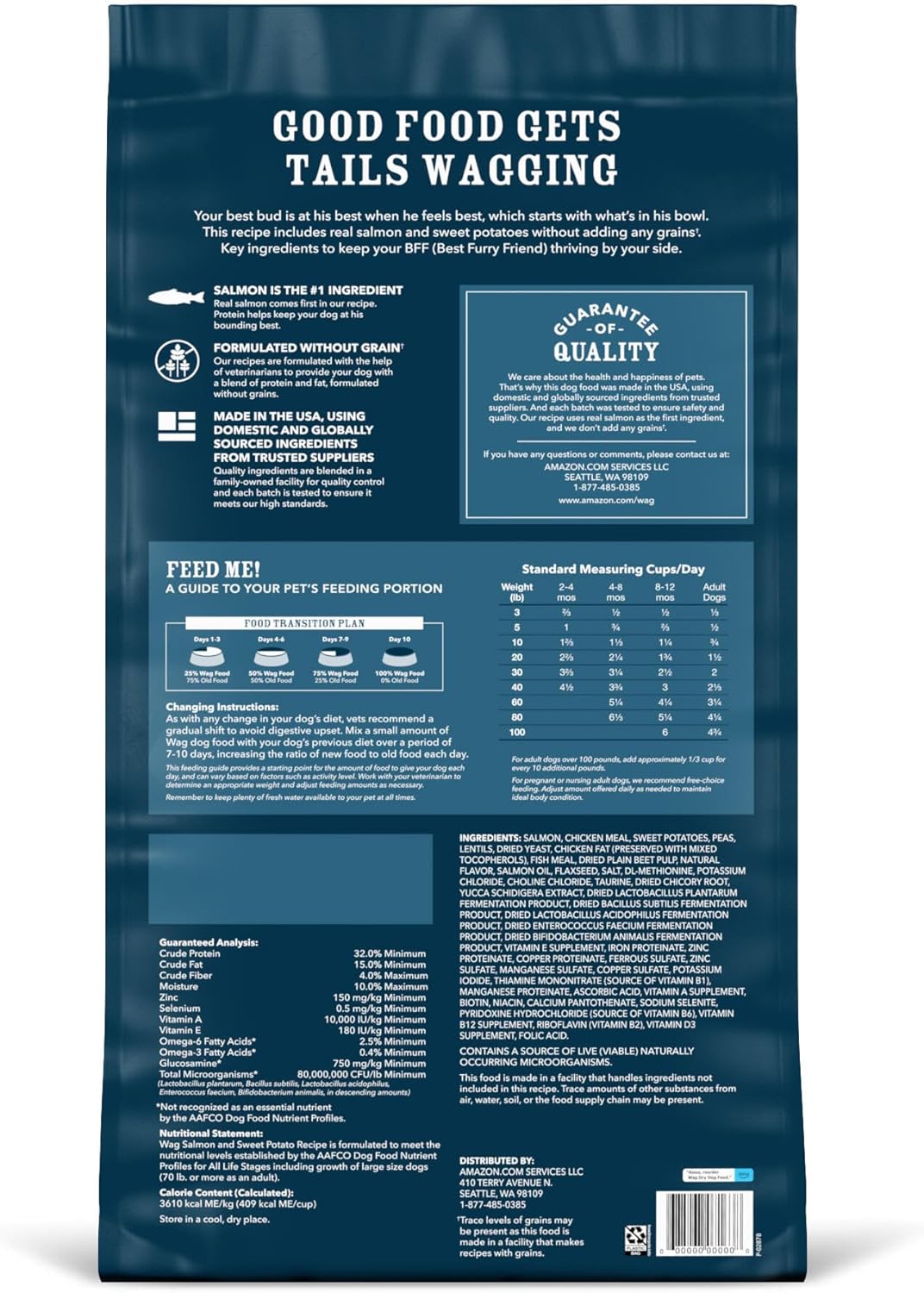 Amazon Brand - Wag Dry Dog Food, Meat and Sweet Potato, Grain Free Sustainably-raised Salmon is the #1 ingredient; protein helps keep your dog at his bounding best