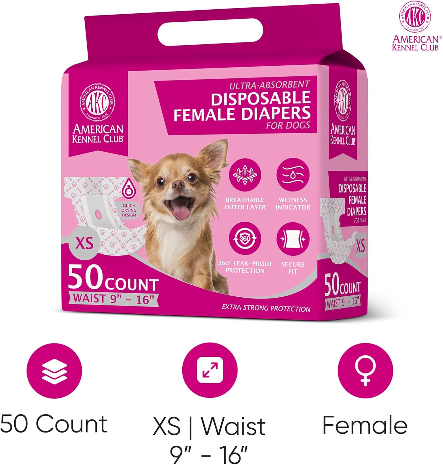 The American Kennel Club Dog Wrap Disposable Diaper is the perfect solution for any dog. With a built-in wetness indicator, you can quickly tell when it's time to replace the diaper and rest assured that our 360 degree leak proof protection edge guard will keep all unwanted messes contained. Our quick drying inner absorbency core helps to lock in moisture without creating a long-term wet feeling that could irritate your dog's skin. The breathable outer layer provides a comfortable fit while an adjustable closure ensures the right size and snug fit every time. (please ensure to measure your dog and review our size guide before purchasing) And no worries when it comes to clean up -- with our disposable design, enjoying on-the-go convenience just got easier! So if you're looking for an easy way to help make potty training a breeze, then get your American Kennel Club Dog Wrap Diaper today!
