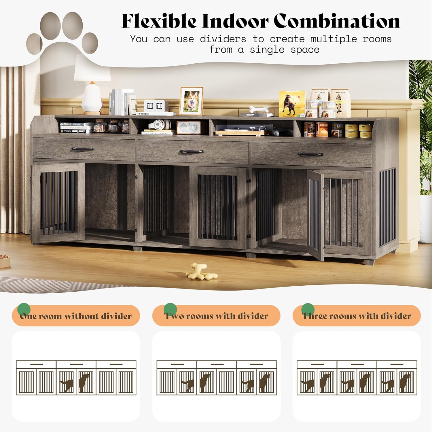 - FLEXIBLE ROOM CONFIGURATION – Includes 2 removable dividers to create 1, 2, or 3 crate areas. Adjust space for dog size, number, or training needs, offering both comfort and versatility for multi-dog households