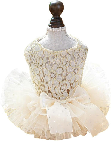 ANIAC Embroidered Dog Dress for Small Dog,Girl Puppy Princess Tutu Dress with Leash Ring,Cat Apparel,Chihuahua Yorkie Clothes for Birthday Wedding (Large, Champagne)