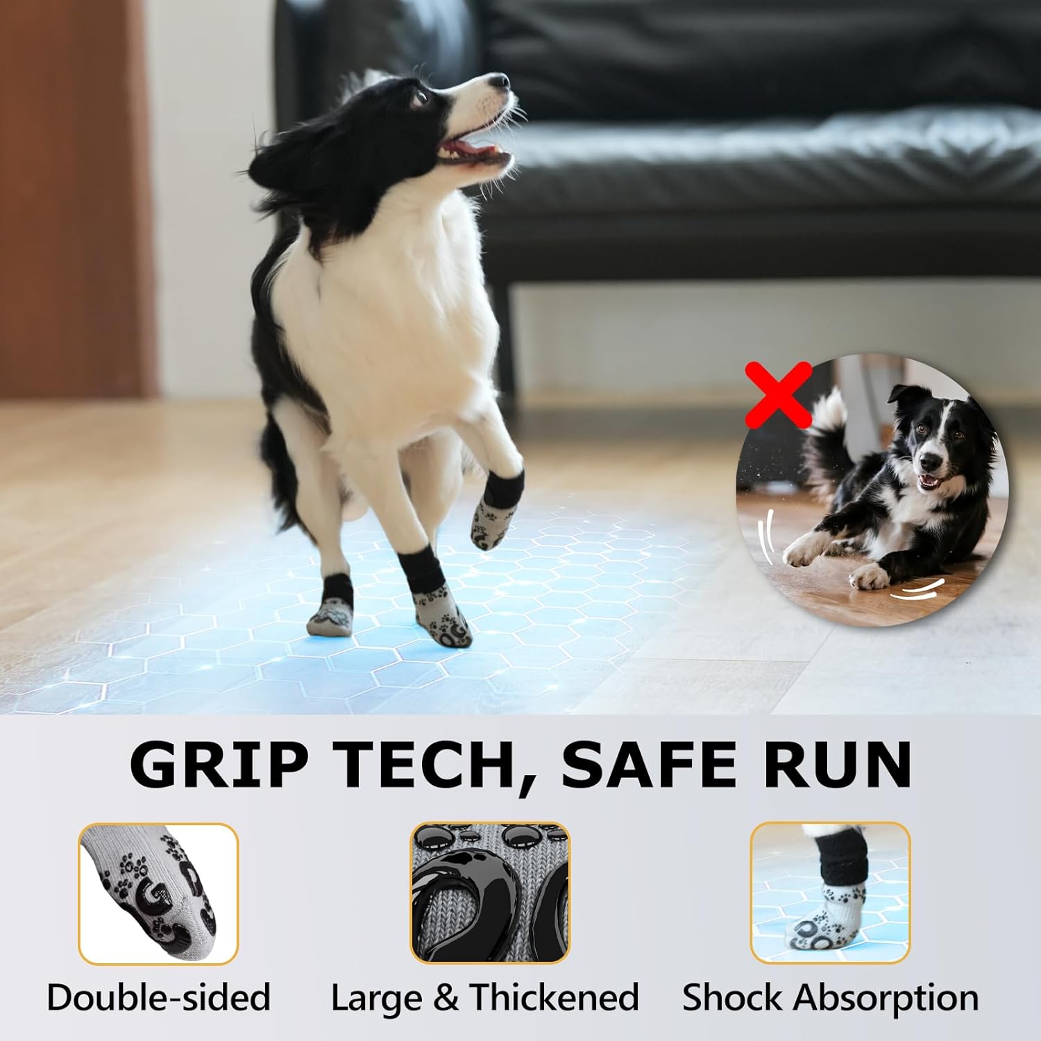 • TESTED EFFECTIVE NON-SLIP GRIP: The dog socks have double-sided anti-slip dot adhesive on the bottom, very good anti-slip performance, the anti-slip properties have been tested on hardwood floors, asphalt, concrete, marble, tiles, sofas, carpets, even if the socks are twisted, their anti-slip properties still remain stable, preventing your dog from slipping and falling during indoor and outdoor activities.