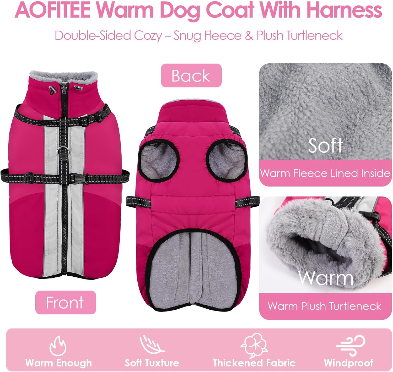 - Dog Coat with All-in-One Harness Integration: AOFITEE dog jackets features built-in secure D-ring and Harness for easy instant leash attachment. No extra gear needed! Perfect for walks and outdoor adventures—convenient, safer, comfortable