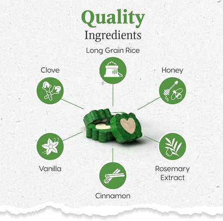 - ALL NATURAL DENTAL CHEW: The patented toothpaste soft center chew fights plaque, tartar and bacteria causing bad breath with natural ingredients such as alfalfa, cinnamon, vanilla, and clove.