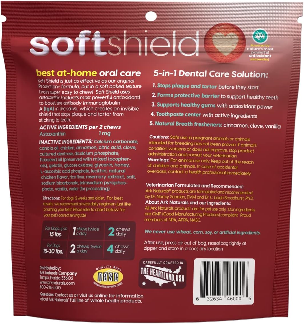 Chew time shouldn't be limited to super chewers! Ark Naturals Soft Shield Brushless Toothpaste is the first of it's kind, soft baked dental chew. These 5-in-1 natural and tasty chews have all the same benefits as our original Protection+, like stopping plaque and tartar before it starts to keep them "Healthy from Tooth to Tail." They also support healthy gums, starting from the inside out by harnessing the antioxidant power of astaxanthin to increase protective antibodies in the saliva and form a protective barrier on teeth. This unique process is why it doesn't matter how long it takes your dog to chew, they're still getting the dental protection they need. And we couldn't forget our signature toothpaste center that provides polishing action! Natural breath fresheners: cinnamon, clove, and vanilla are tasty and will have your pup begging for two a day!