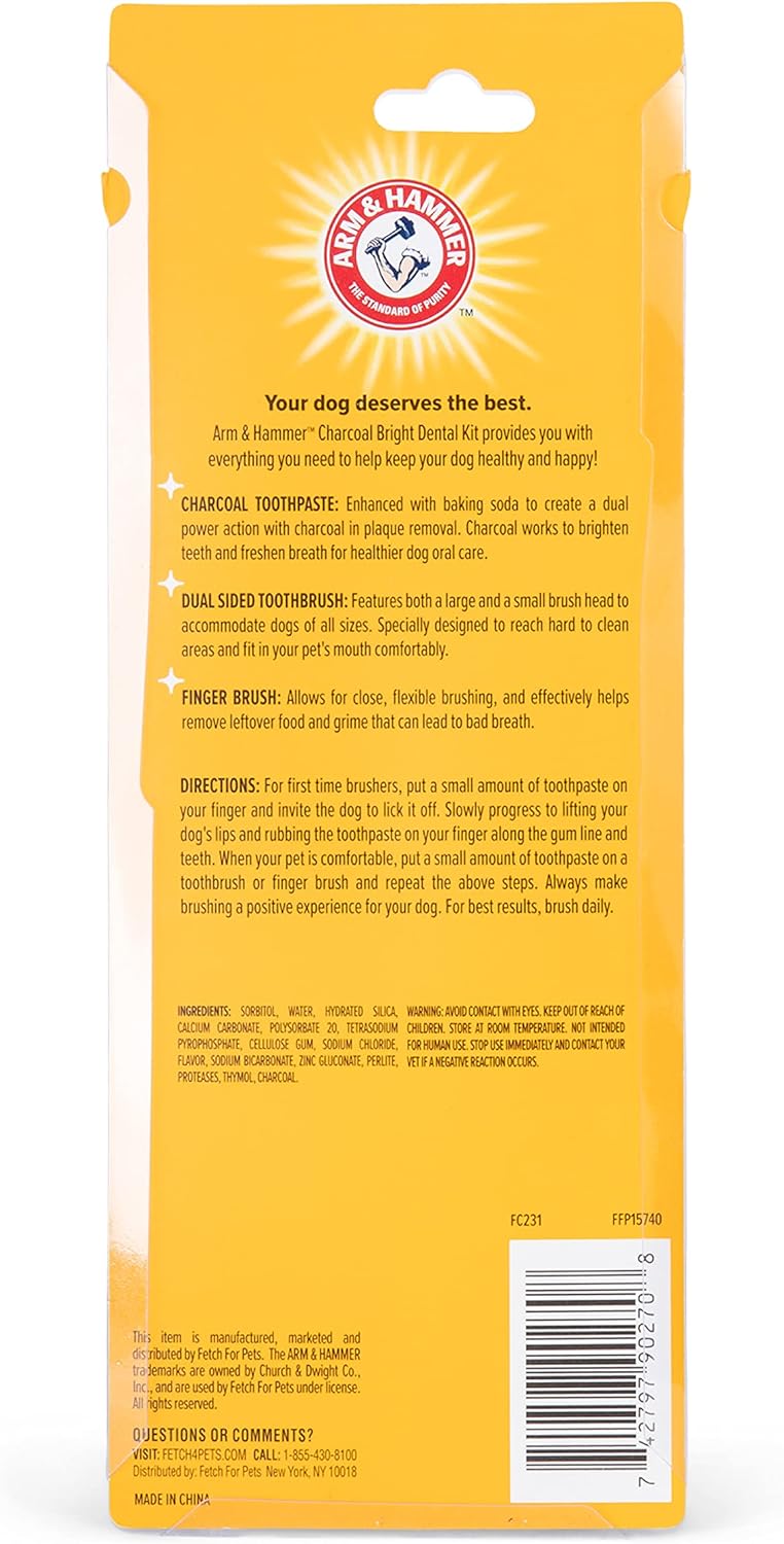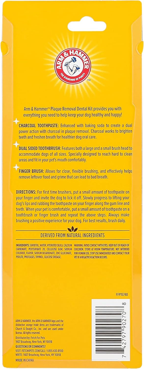The Arm & Hammer Charcoal Plaque Removal Dental Kit for Dogs uses the whitening properties of charcoal, combined with power of baking soda, and adds in natural ingredients to effectively remove plaque from your dog's teeth. Complete with a multiple-size dog toothbrush to make it suitable for both big dogs and small dogs, baking soda enhanced charcoal toothpaste for dogs, and a finger brush, this dental kit for dogs gives you results you can see. This dog toothpaste has a fresh mint flavor that dogs love, making it easier than ever to promote good dental health for your pup. Brighten your dog's smile with Arm & Hammer.Directions: For first time brushers, put a small amount of toothpaste on your finger and invite the dog to lick it off. Slowly progress to lifting your dog's lips and rubbing the toothpaste on your finger along the gum line and teeth. When your pet is comfortable, put a small amount of toothpaste on a toothbrush or finger brush and repeat the above steps. Always make brushing a positive experience for pets. For best results, brush daily.Ingredients: Sorbitol, Water, Hydrated Silica, Calcium Carbonate, Polysorbate 20, Cellulose Gum, Sodium Chloride, Flavor, Sodium Bicarbonate, Zinc Gluconate, Perlite, Proteases, Thymol, Glucose Oxidase.WARNING: Avoid contact with eyes. Keep out of reach of children. Store at room temperature. Not intended for human consumption. Stop use immediately and contact your vet if a negative reaction occurs.YOUR SATISFACTION IS OUR PRIORITY: If you have any questions or feedback, please reach out to us directly at info@fetch4pets.com