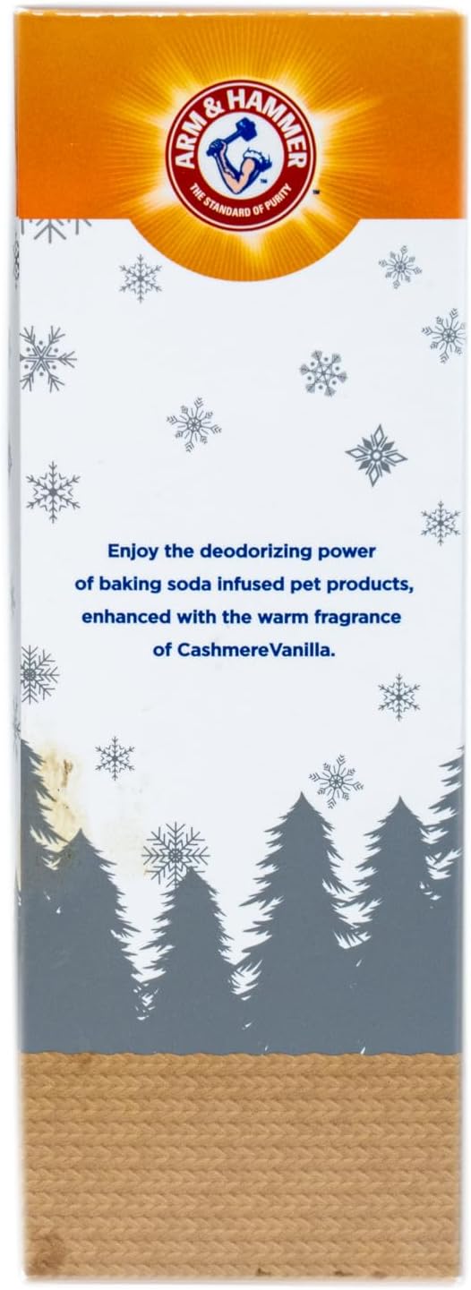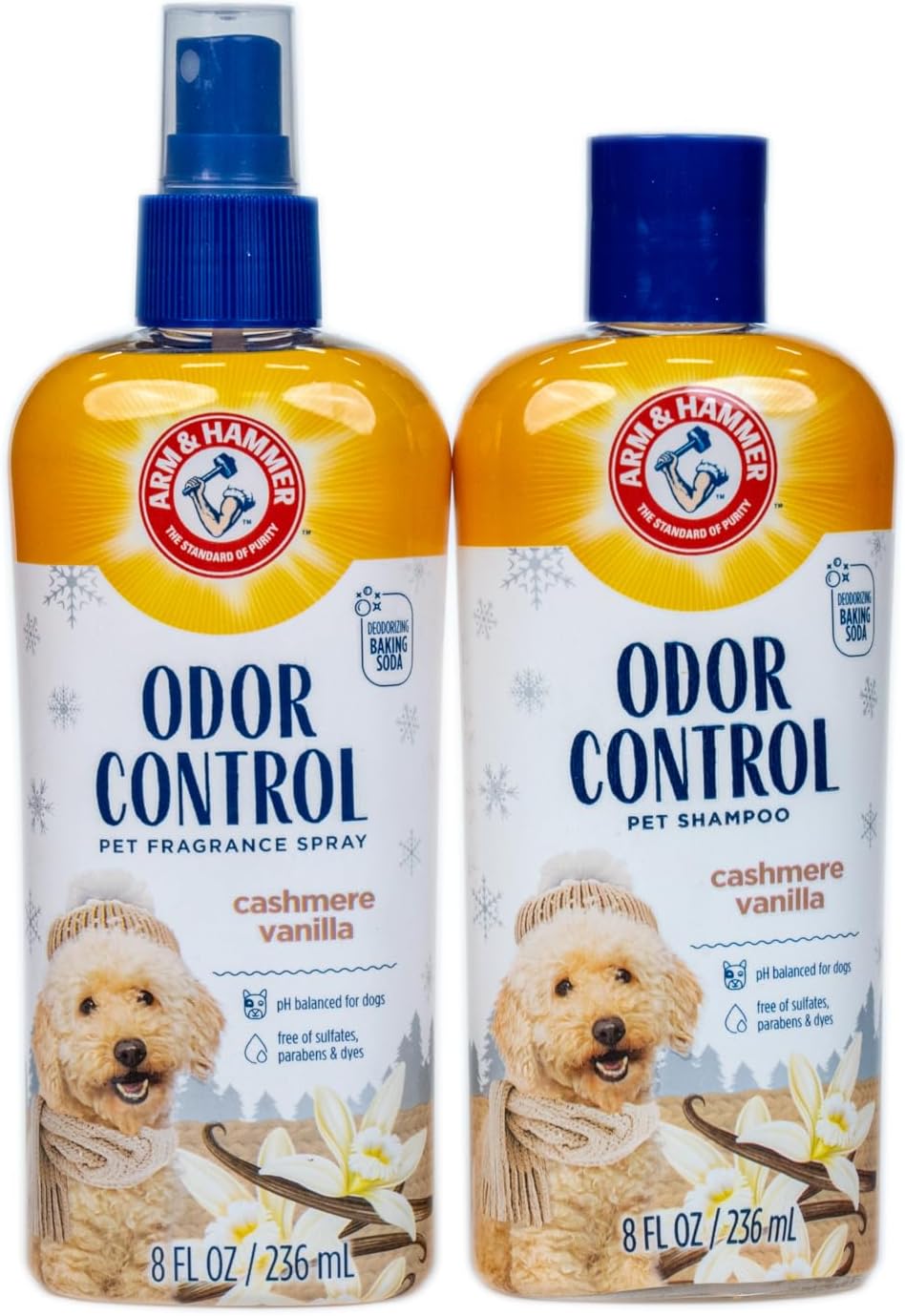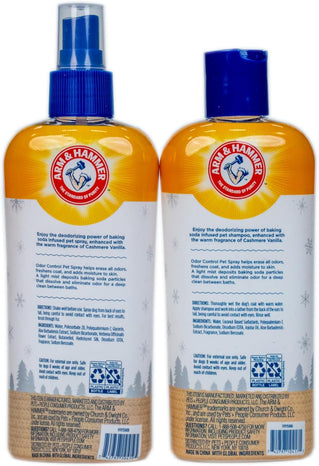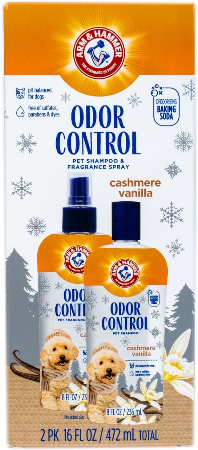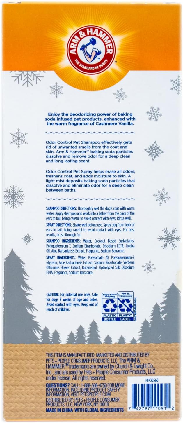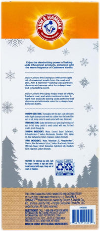 Bathe your dog with the name you trust. Arm & Hammer™ uses the power of baking soda to refresh a stinky dog coat and neutralize odor. The baking soda dissolves into fine particles, getting into hard-to-reach areas, resulting in a deeper clean. Arm & Hammer for Pets Odor Control Grooming Kit features 8oz of shampoo and 8oz of bath spray. These formulas effectively get rid of unwanted smells from your dog’s coat. A cozy Vanilla Cashmere scent lightly rests on the coat after use. The grooming spray will make it easy to deodorize dogs between baths, and it is safe to use with topical treatments. Our formula is gentle enough for all dogs and puppies 8 weeks and older to use, and leaves behind a warm holiday nostalgia smell that you’ll both love! DIRECTIONS: Shampoo: Thoroughly wet your dog’s coat with warm water. Apply the dog deodorizing shampoo and work it into a lather, starting from the back of the ears and moving towards the tail. Be careful to avoid contact with eyes. Rinse well for best results. For puppies, use this as a puppy shampoo or shampoo for puppies to ensure a gentle, effective cleanse. Spray: Spray dog from back of ears to tail, carefully avoiding eyes. Massage into coat. Repeat as necessary. Can be used on wet or dry fur. For external use only. Safe for dogs 8 weeks of age and older. Avoid contact with eyes. Keep out of reach of children.