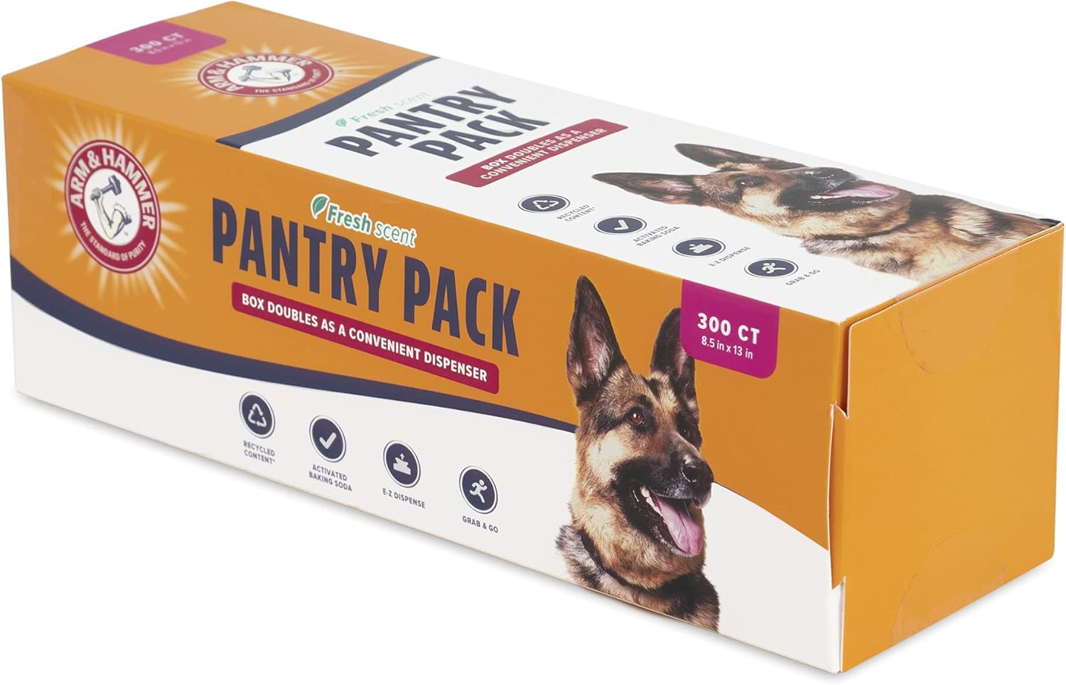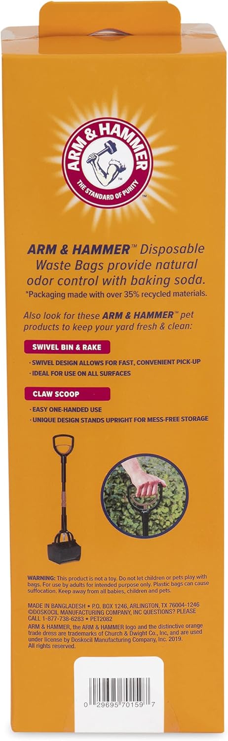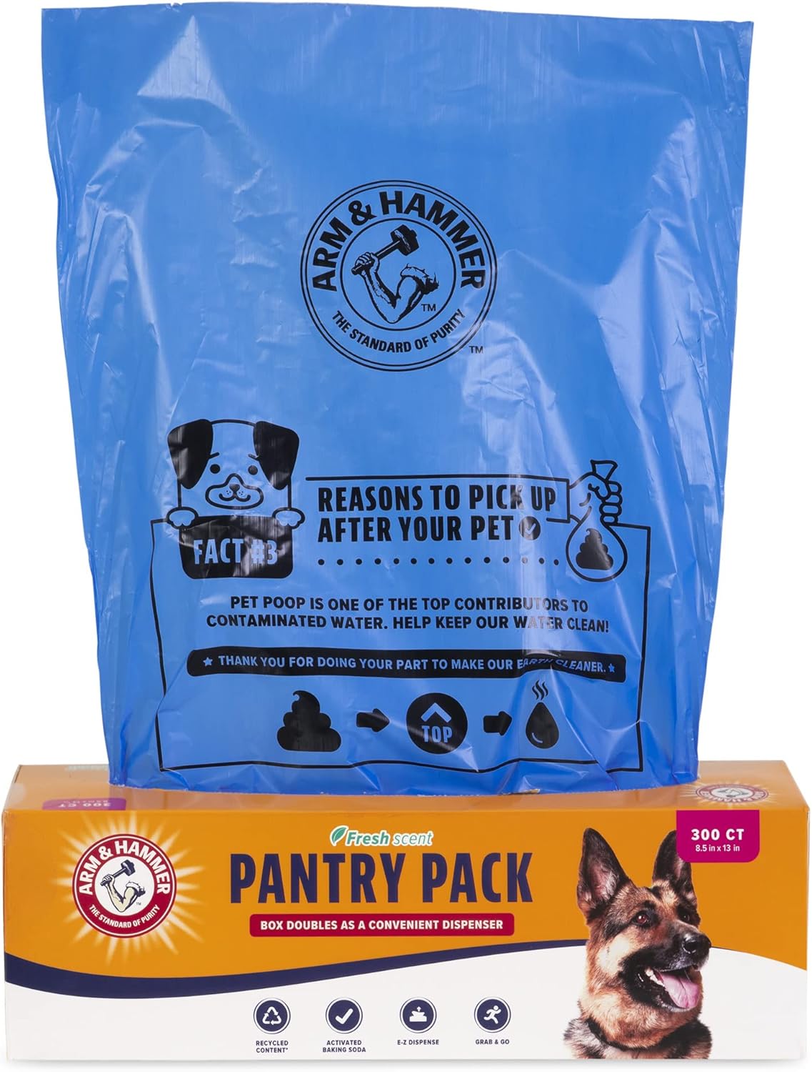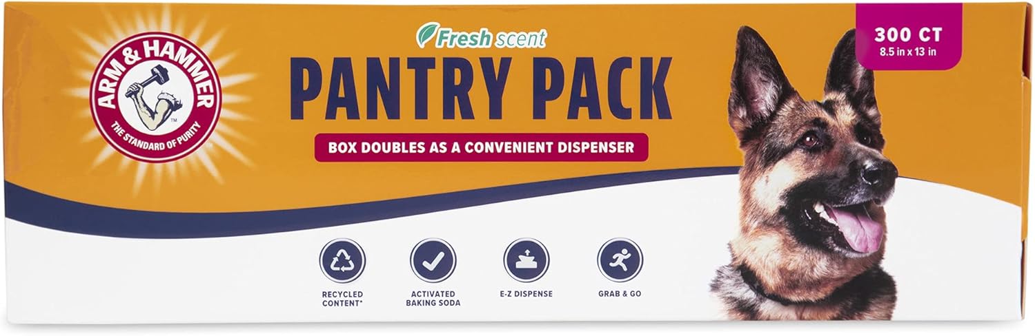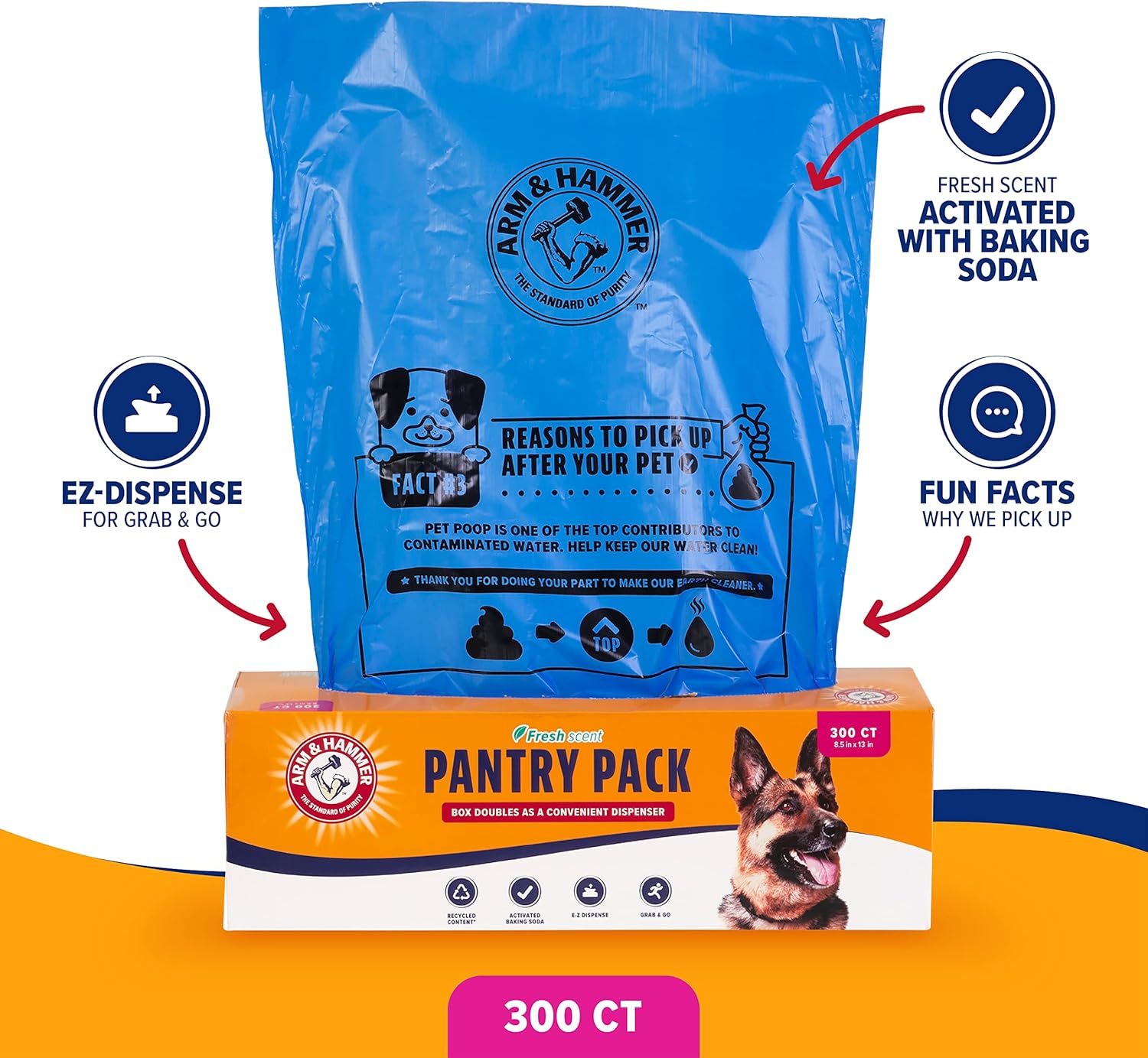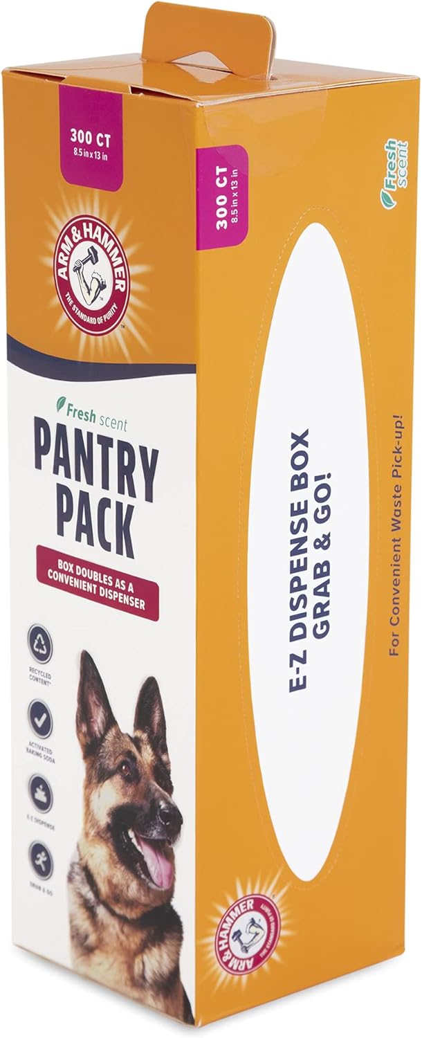 Arm Hammer's® Pantry Pack Disposable Waste Bags are multi-purpose waste bags that can be used for dog waste pick up; dirty diapers; storing wet bathing suits; or any other purpose you could think of. To help reduce offensive odors; these waste bags are made with activated baking soda that gives off a fresh scent. The EZ Dispense Box allows you to grab and go pick up what ever you need fast and easily. Each bag has two easy tie handles that can be tied together and easily thrown away. Keep your yard clean and make pick up easy with Arm Hammer Pantry Pack Waste Bags.
