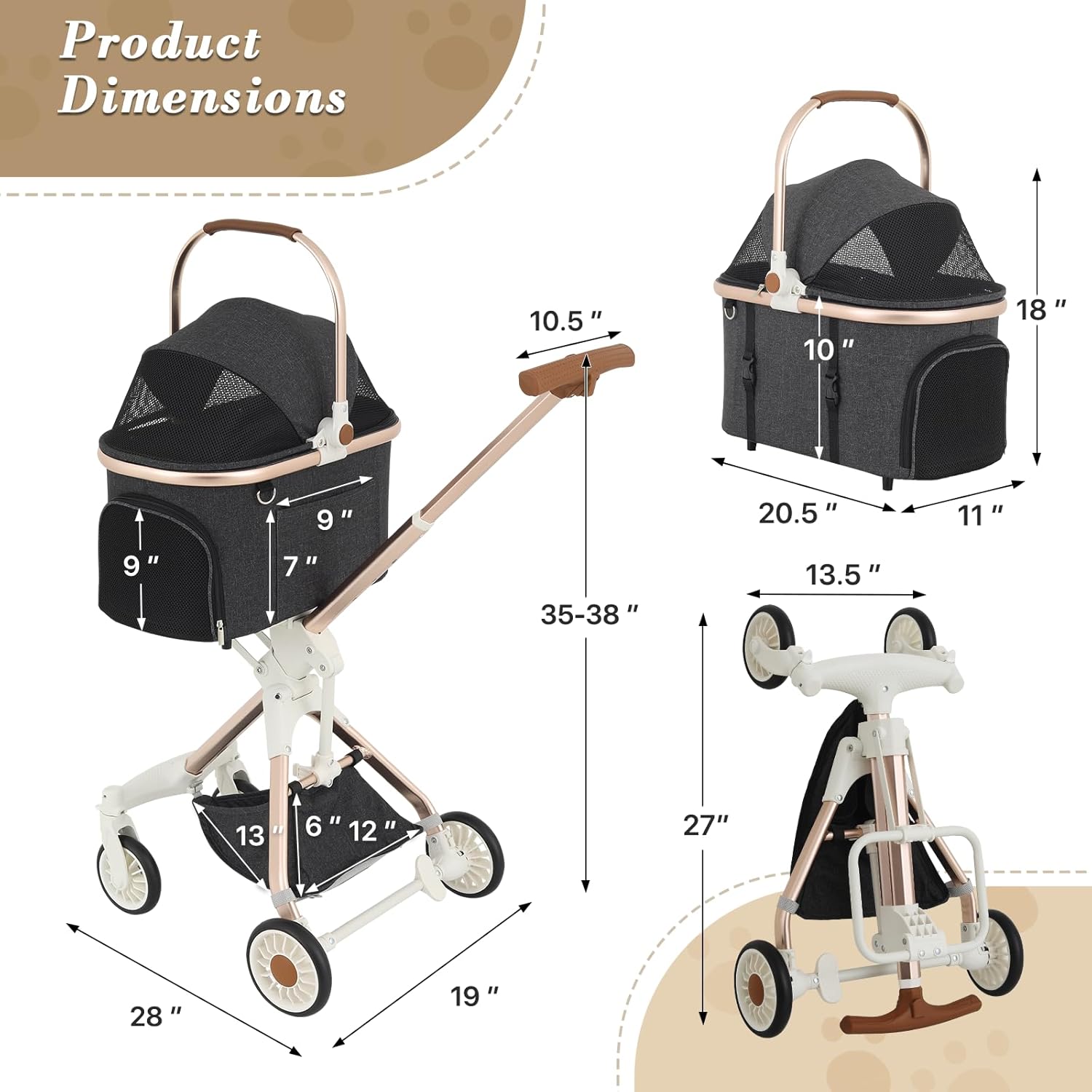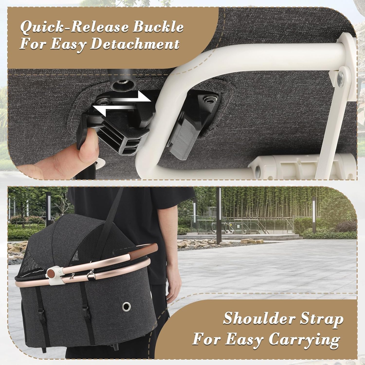 - Versatile 3-in-1 Functionality: This dog stroller effortlessly converts into a carrier bag and car seat, providing convenience for walking, traveling, or driving. It includes a removable basket for easy pet access and added functionality