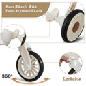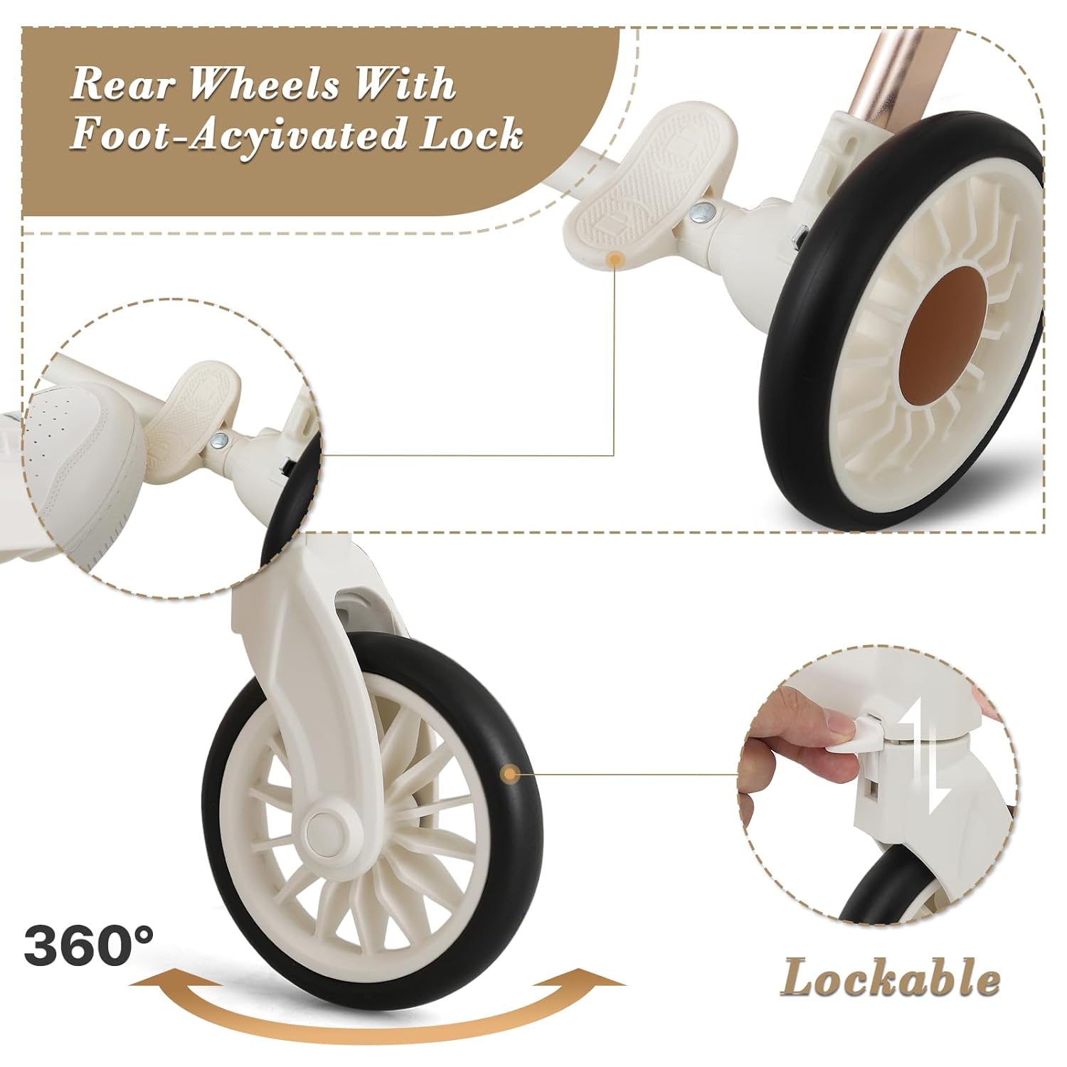 - Superior Wheel System: Designed for smooth navigation, the stroller features a robust wheel system with 5-inch front wheels for agility and 6-inch rear wheels for stability. Reliable rear wheel brakes ensure safe strolling