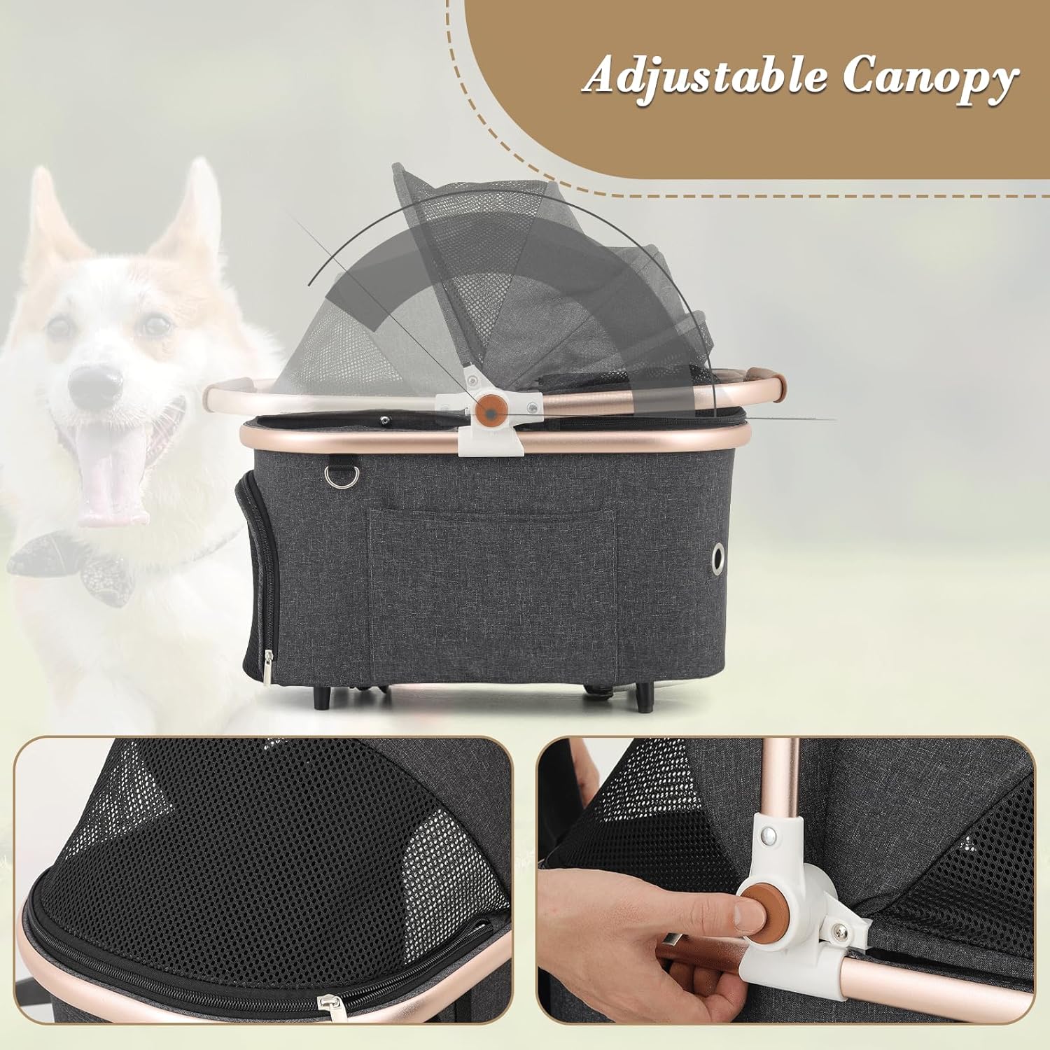 - Adjustable Comfort Features: The pet stroller offers an adjustable canopy, breathable mesh windows, and a padded interior to ensure your pet’s comfort. Dual-access zippered fronts make it easy for pets to enter and exit