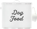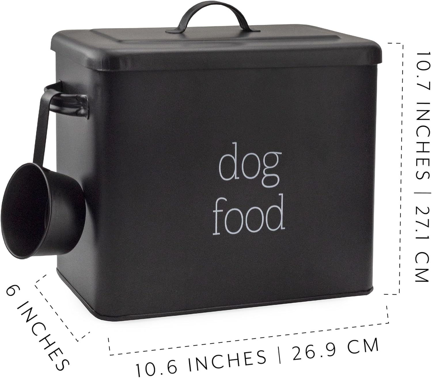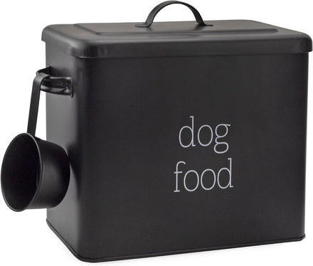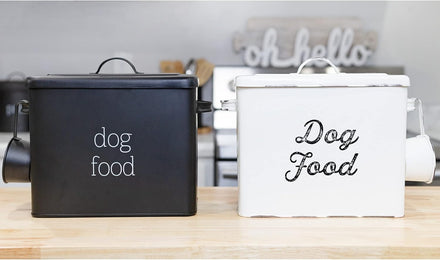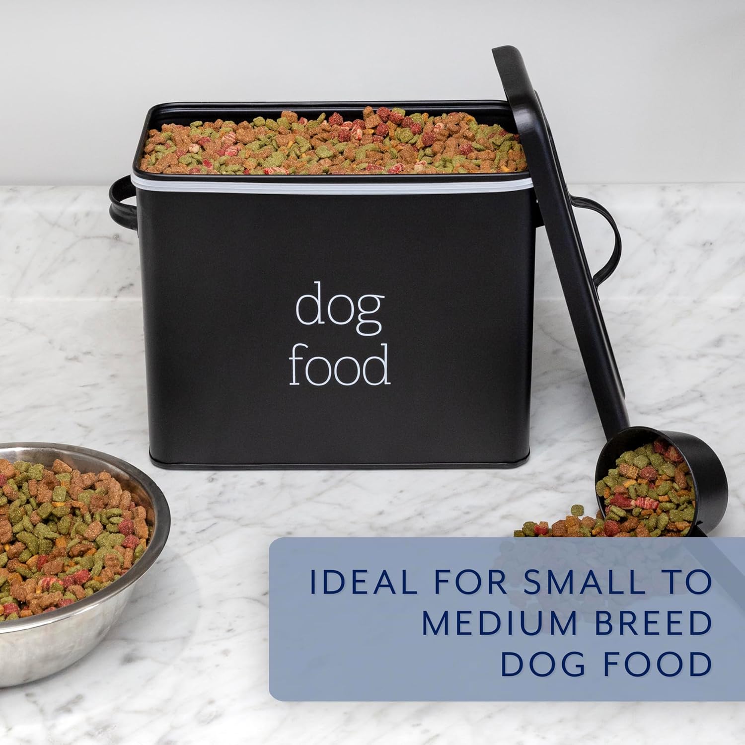Decoratively store your pet’s food with our sturdy storage container! Perfect for your kitchen countertop or pantry. Accent your modern farmhouse decor with this matte black enamelware dog food storage box. It comes with an easy open lid and a hanging measuring scoop for your convenience. This bin generously holds 9 quarts of your pup’s favorite food, ideal for small to medium sized breeds for everyday storage of smaller quantities of feed.