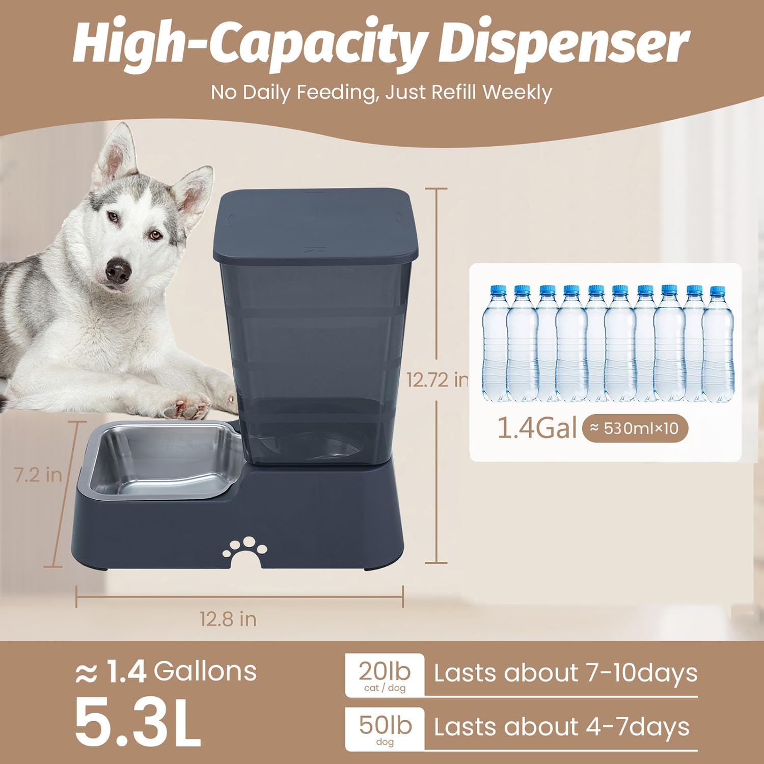 - 【Large Capacity】--- 5.4L / 1.4Gal Capacity,Works for small & medium & big -sized dogs and adult cat. It slowly refills water/food to the bowl by gravity and extends the refill time. The daily water/food supply for pets will be sustainable and very suitable for pet owners to travel or busy work.