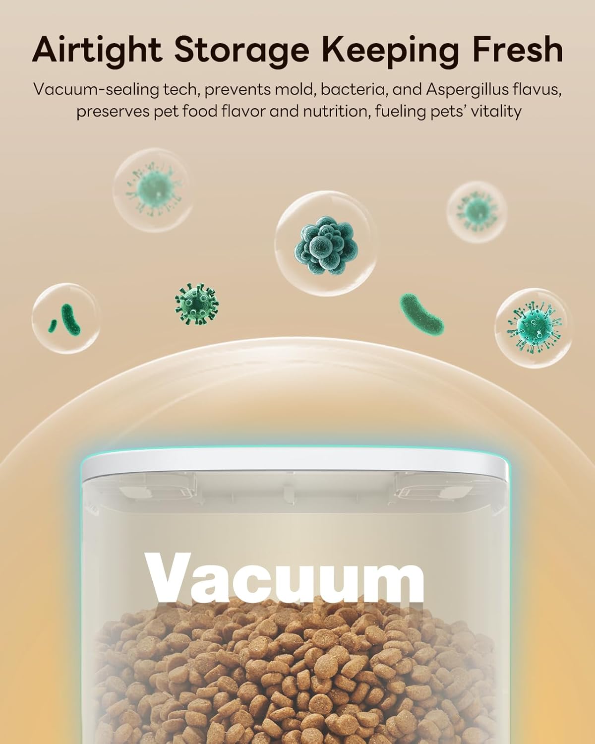 - 🛎️【Revolutionary Automatic Evacuation, Every Meal is 100% Fresh】Dokoo's automatic dog food dispenser has unique vacuum sealing technology, creates a low-pressure, low-oxygen environment to inhibit oxidation by using a vacuum pump to pump out air and lock lid on the top, firmly locking the top of the granary, completely isolating the air and keeping every kibble fresh like just opened. The original nutritional value and crispy taste are maintained to allow fur companions to always have healthy meals.