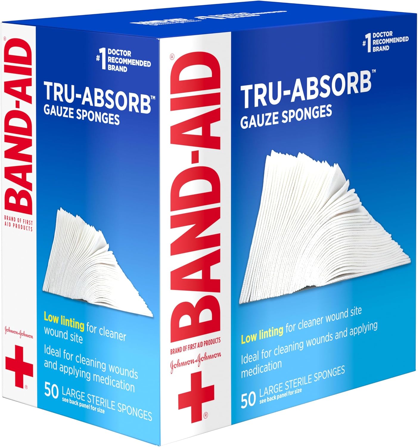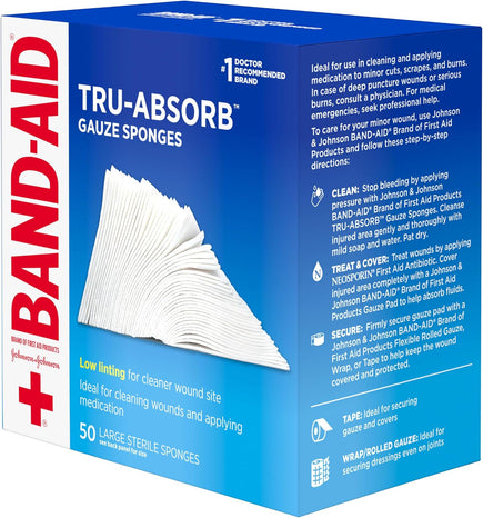 - 50-count package of Large Band-Aid Brand of First Aid Products Tru-Absorb Sterile Gauze Sponges for minor wound care. Use absorbent gauze pads for cleaning and applying medication to minor wounds, cuts, and burns