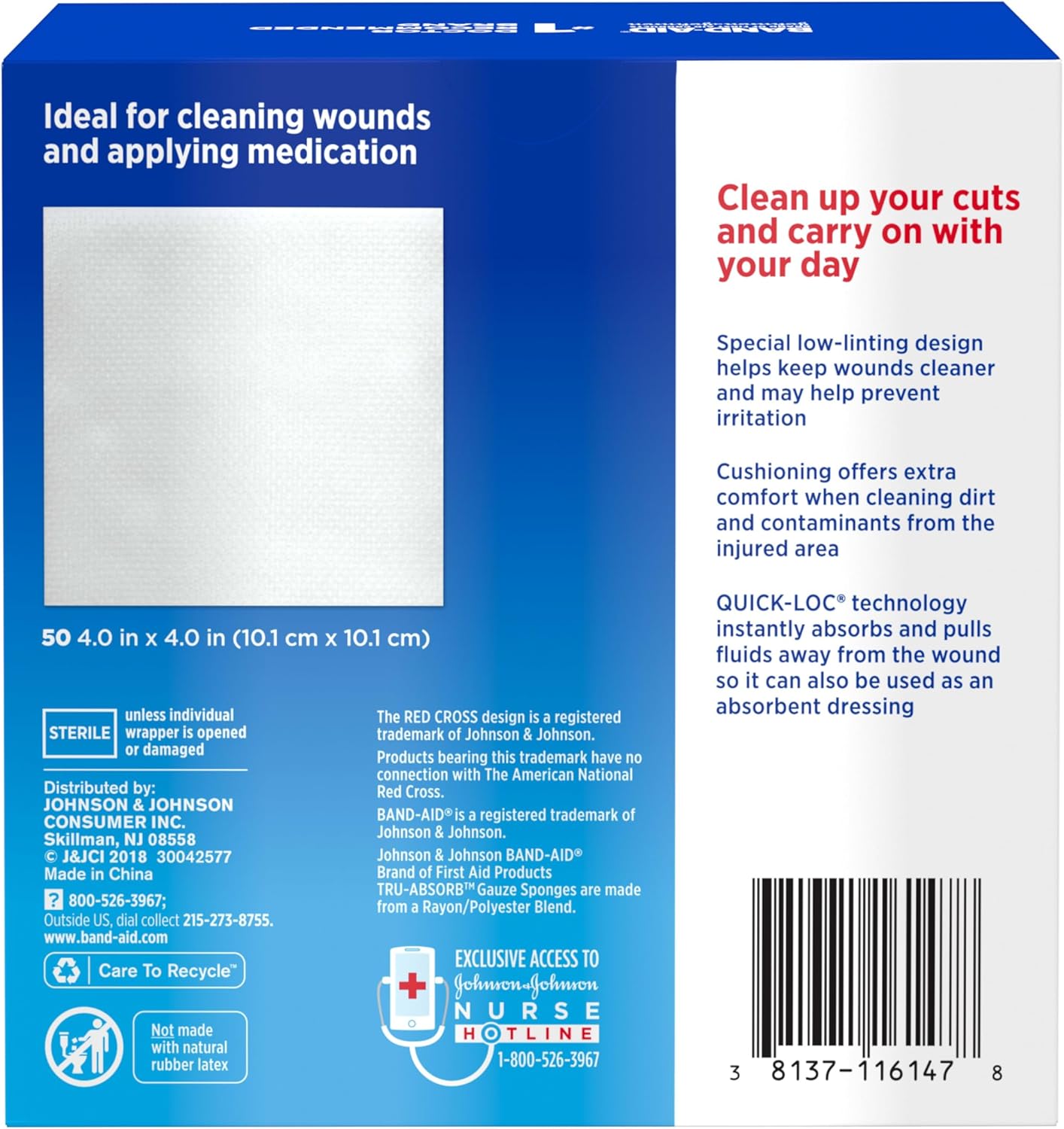 Delicately care for wounds with Band-Aid Brand of First Aid Products Tru-Absorb Sterile Gauze Sponges. Each large gauze sponge measures 4 inches by 4 inches, making them ideal for cleaning and applying medication to minor cuts, scrapes and burns. Their special low-linting design helps provide cleaner wounds and may help prevent irritation. Their pillow-soft cushioning offers extra comfort when cleaning dirt and contaminants that may cause infection from the injured area. These absorbent pads can also be used as a cushioning dressing for minor wounds, cuts and burns. Use these gauze sponges as first aid supplies, and for cleaning and prepping wounds, or for applying medication. This package contains 50 individually wrapped sterile gauze sponges, making them a perfect addition to any first aid kit.