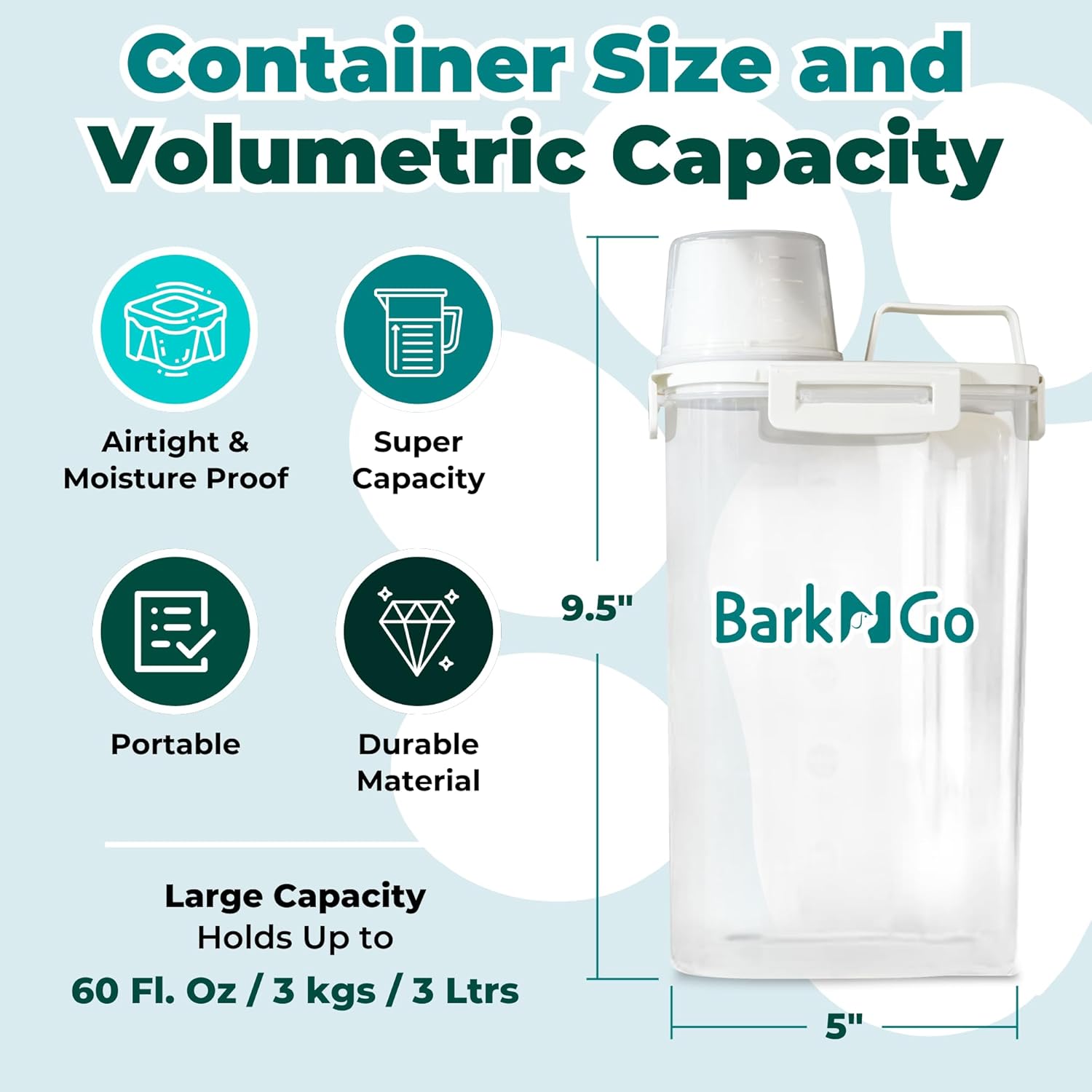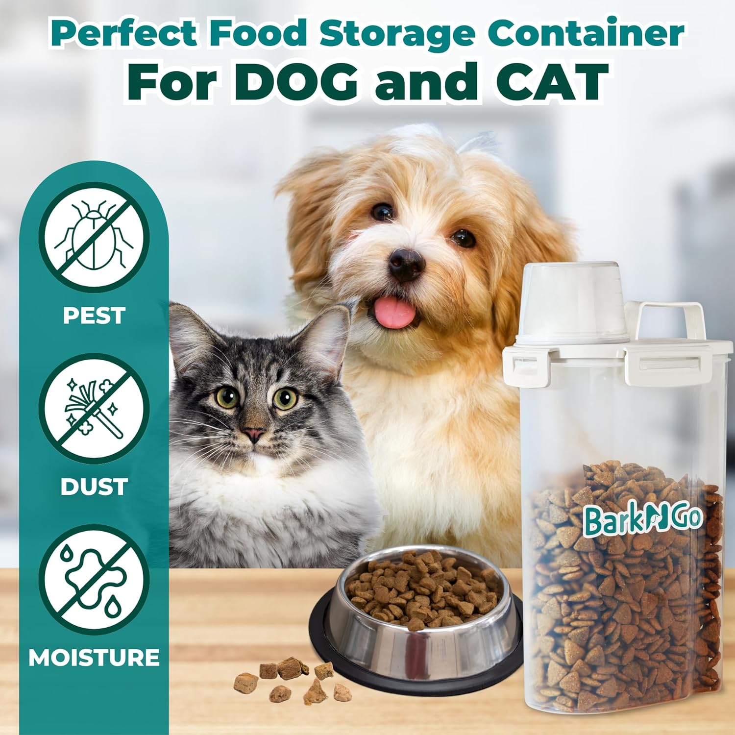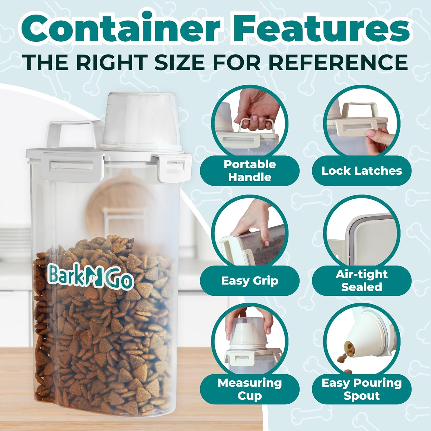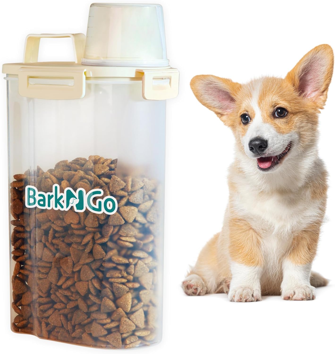 - PORTABLE AND PRACTICAL: Convenience is key with the BarkNGo dog food storage solution. The container’s portable design features an easy-grip handle, allowing you to move it effortlessly from pantry to feeding area. Whether you’re traveling, camping, or just moving around the house, this large dog food storage container is built to go wherever your pet goes.