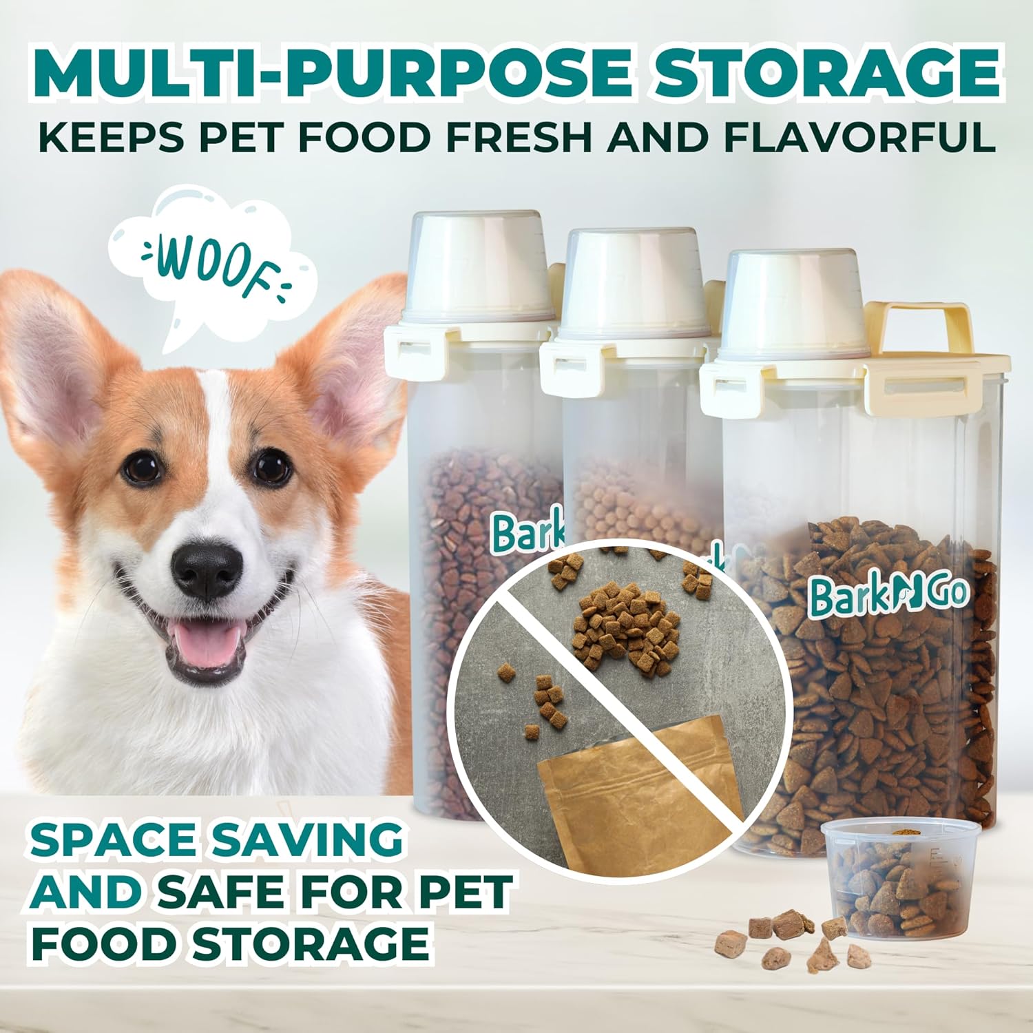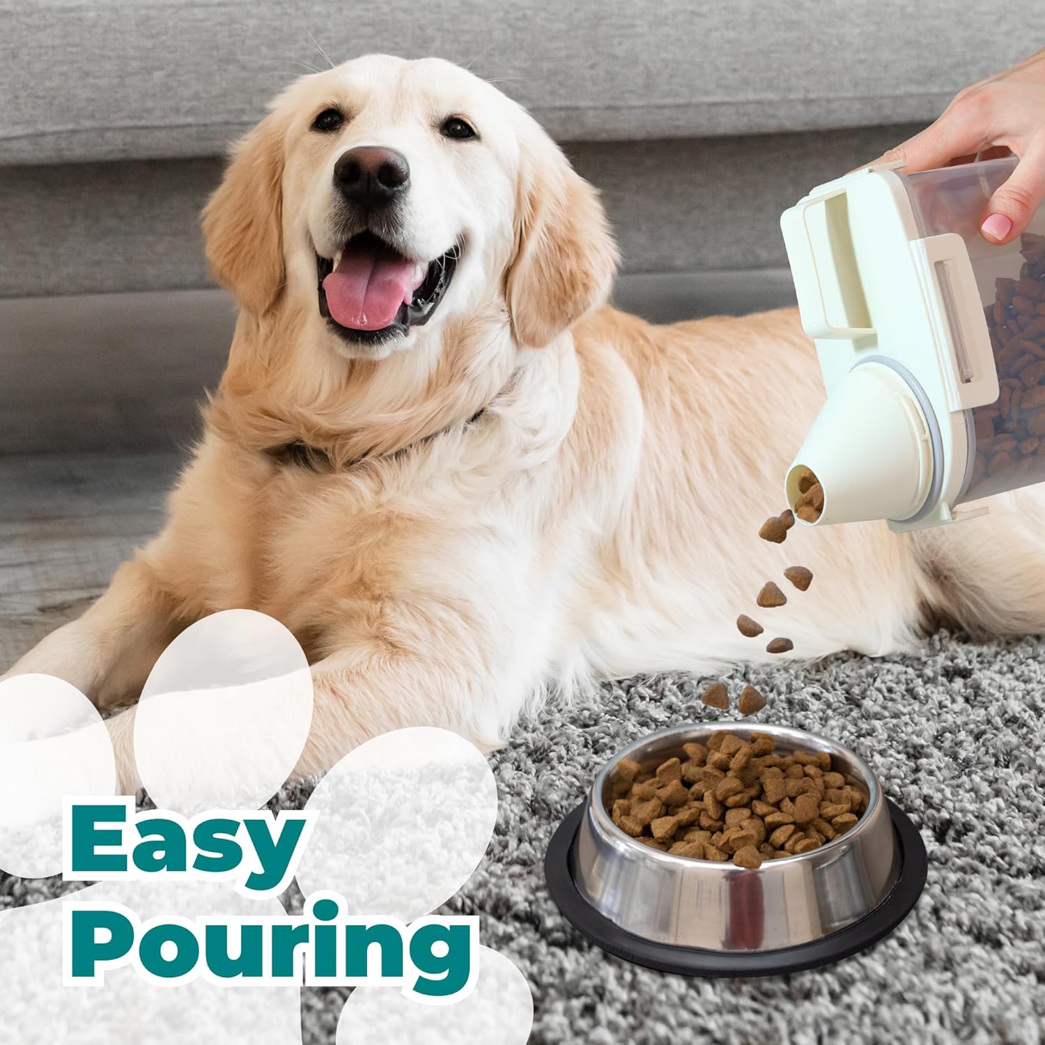 - INNOVATIVE DESIGN WITH EASY POURING SPOUT: Say goodbye to messy scoops and spills. Our dog food storage container is equipped with an innovative easy-pour spout, making feeding time quick, clean, and hassle-free. The included measuring cup ensures accurate portions every time, helping you maintain your pet’s diet without the guesswork. This dog food container offers both convenience and precision for every feeding session.