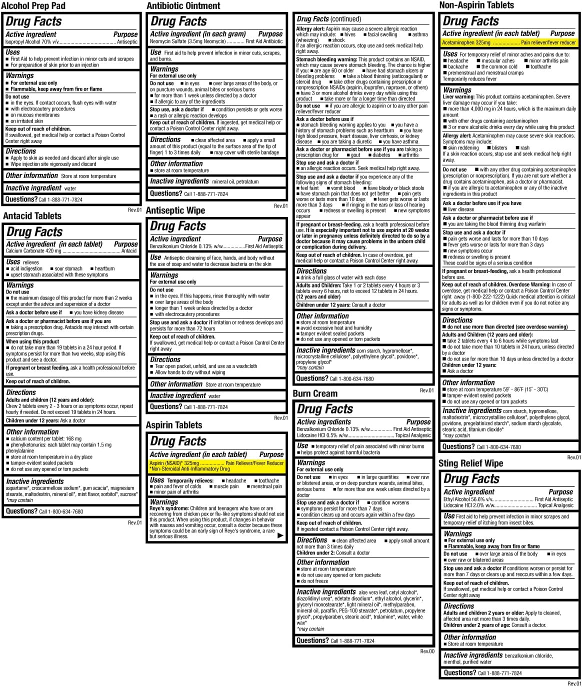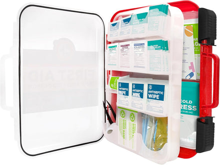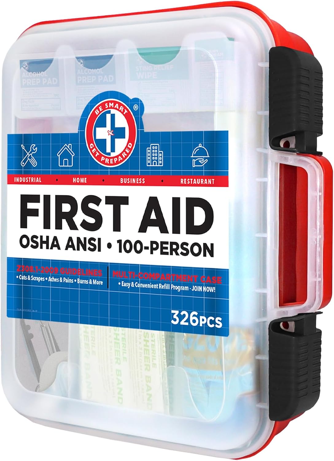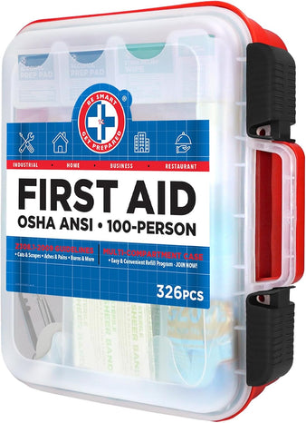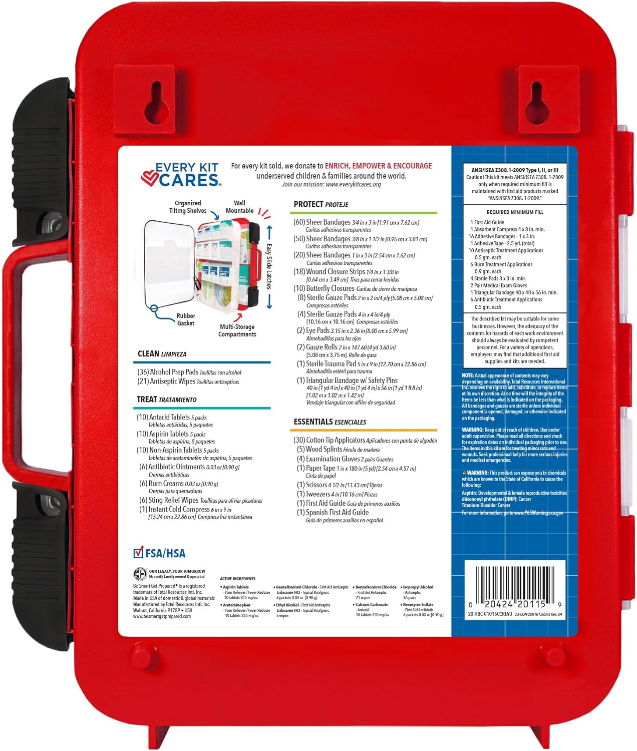 Manufactured by the #1 leading manufacturer of First Aid Kits in the USA. The Be Smart Get Prepared First Aid Kit complies and exceeds all OSHA guidelines for small business and is perfect for your family and co-workers to feel safe and secure. You can Be Smart and Get Prepared all day, every day. From the leading and trusted company Total Resources International. First Aid includes: -CLEAN- • 21 Antiseptic Towelettes • 36 Alcohol Pads • 6 Sting Relief Pads -TREAT- • 6 Antibiotic Ointment Packets • 6 Burn Cream Ointments • 10 Antacid Tablets • 10 Aspirin Tablets • 10 Non-Aspirin Tablets • 1 Instant Cold Compress 6" x 9" • 1 English First Aid Guide • 1 Spanish First Aid Guide -PROTECT- • 20 Adhesive Bandages 1" x 3" • 50 Adhesive Bandages 3/8" x 1-1/2" • 60 Adhesive Bandages 3" x 3/4" • 10 Butterfly Closures Bandages • 18 Wound Closure Strips 1/4" x 1-1/2" • 2 Gauze Rolls 2" x 4.1 yards • 2 Eye Pads • 8 Gauze Pads 2" x 2" • 4 Gauze Pads 4" x 4" • 1 Trauma Pad 5" x 9" -ADDITIONAL SUPPLIES- • 30 Cotton Tip Applicators • 1 Adhesive Tape Roll 1" x 5 yards • 5 Finger Splints • 1 Triangular Bandage 40" x 40" x 56" • 1 Tweezers • 1 Metal Scissor • 4 Nitrile Gloves