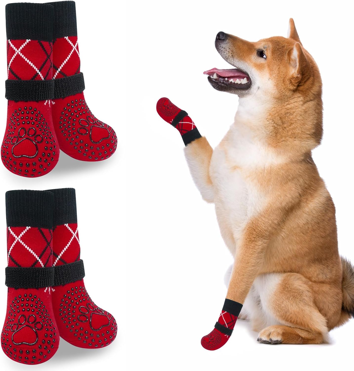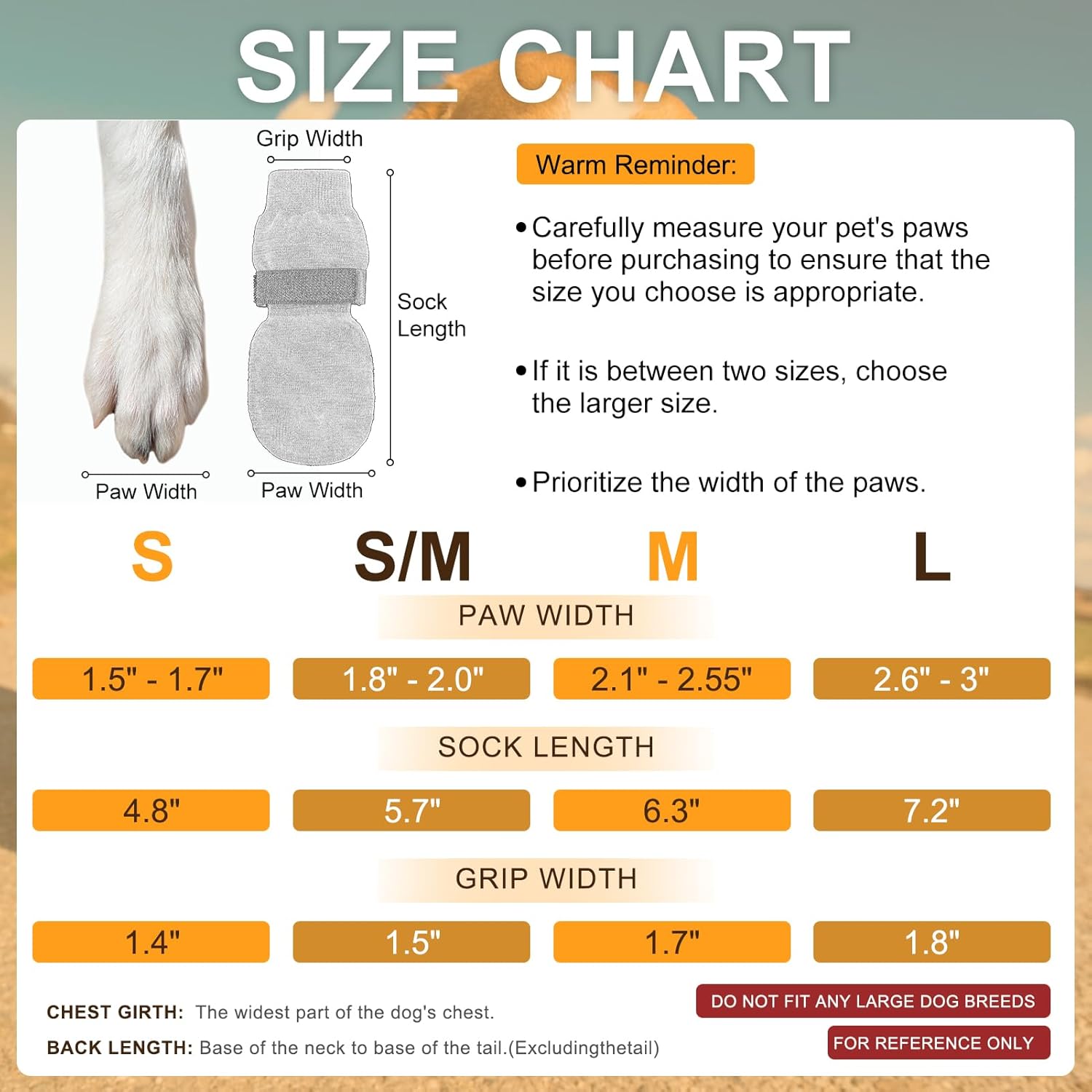 SIZE MATTERS: Includes 4 dog socks with grippers. 1.8" paw width for size small; 2.1" paw width for size small/medium; 2.55" paw width for size medium; 3" paw width for size large. Be sure to measure your pet before purchasing to ensure a perfect fit. If your dog's paw width falls between two sizes, choose the larger size for a more comfortable fit. Any other questions, please contact us