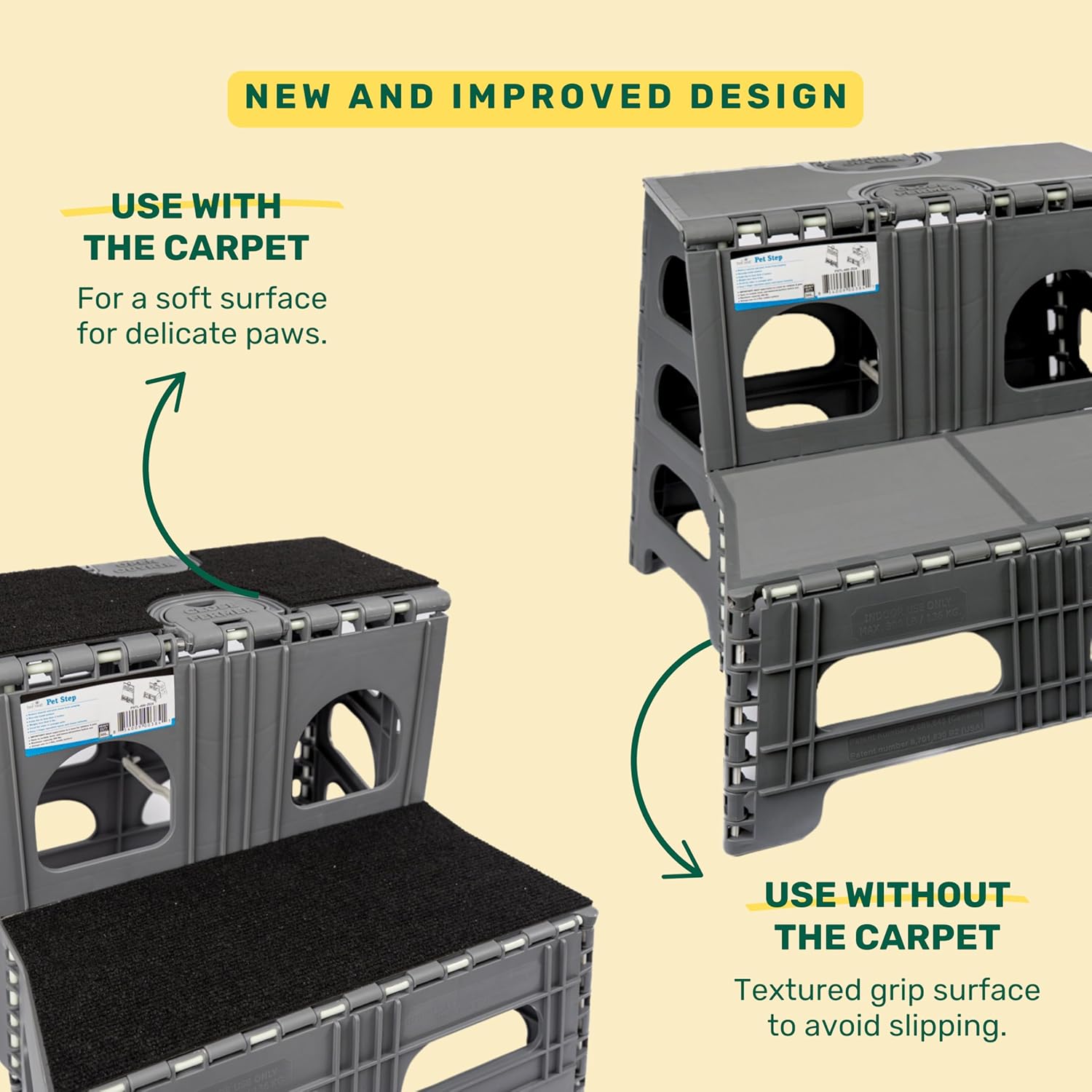 - New and Improved Design: With the new design, our foldable pet stairs are better than a dog step and can be used with the carpet for a soft surface for delicate paws, or can be used without the carpet revealing a textured grip surface to avoid slipping.