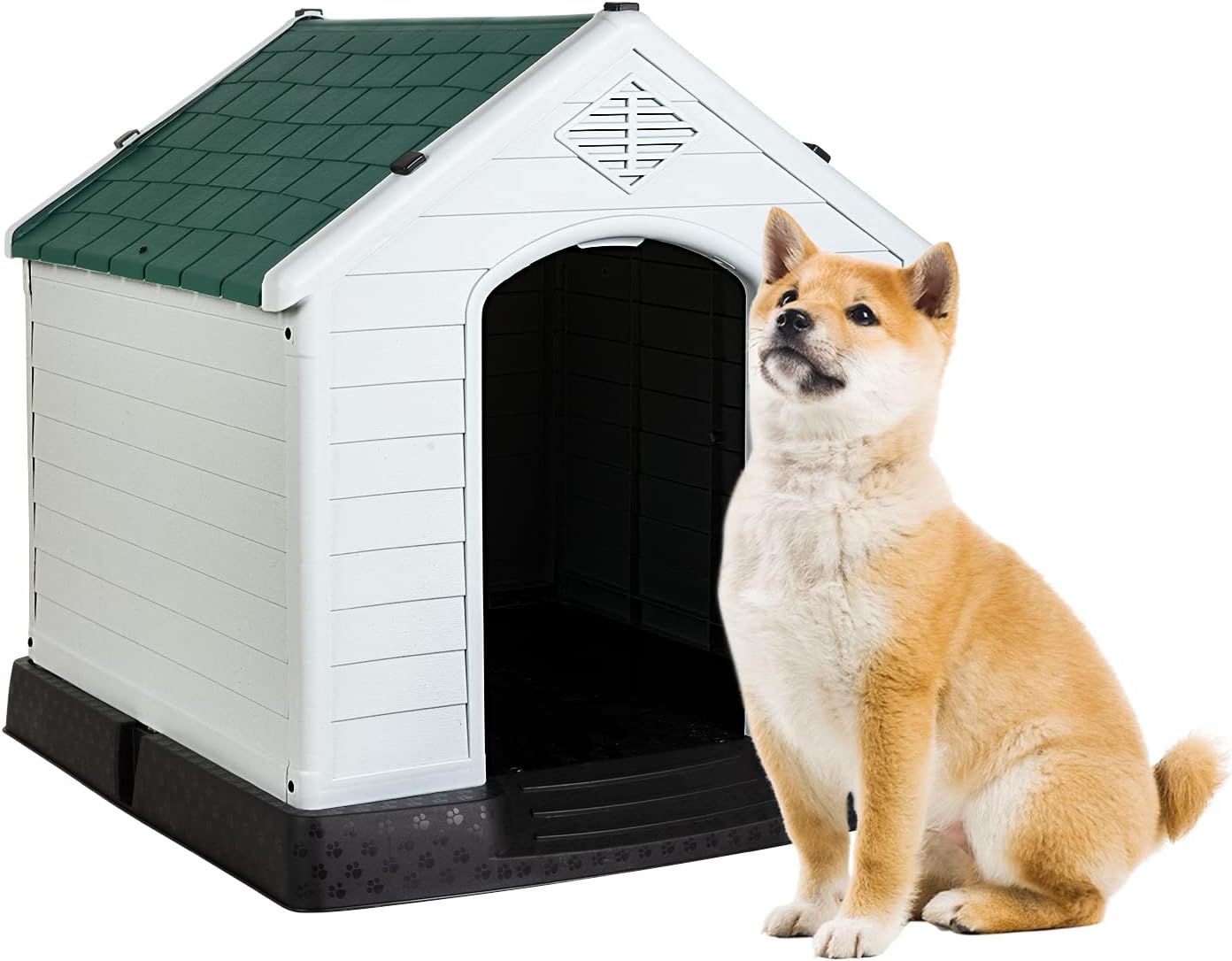 Features: Overall Dimensions: 27in(L)×25in(W)×28 in(H) Net Weight:14.61pounds Color:Green Material:PP ◎Our dog house is made of environmentally friendly PP material, which is durable, sun-proof and waterproof. Perfect for use in the backyard garden, providing a perfect home for your pet. ◎Our plastic dog house provides a comfortable and superior event space, perfect for medium and large size dogs. ◎Smooth surfaces and detachable roof make this outdoor dog house easy to clean. ◎Our large dog house is easy to assemble, instructions are included in the box. According to instructions, an adult can complete the assembly in about half an hour.. ◎Raised floors and waterproof materials keep the dog house from leaking and protect your pet from rain.