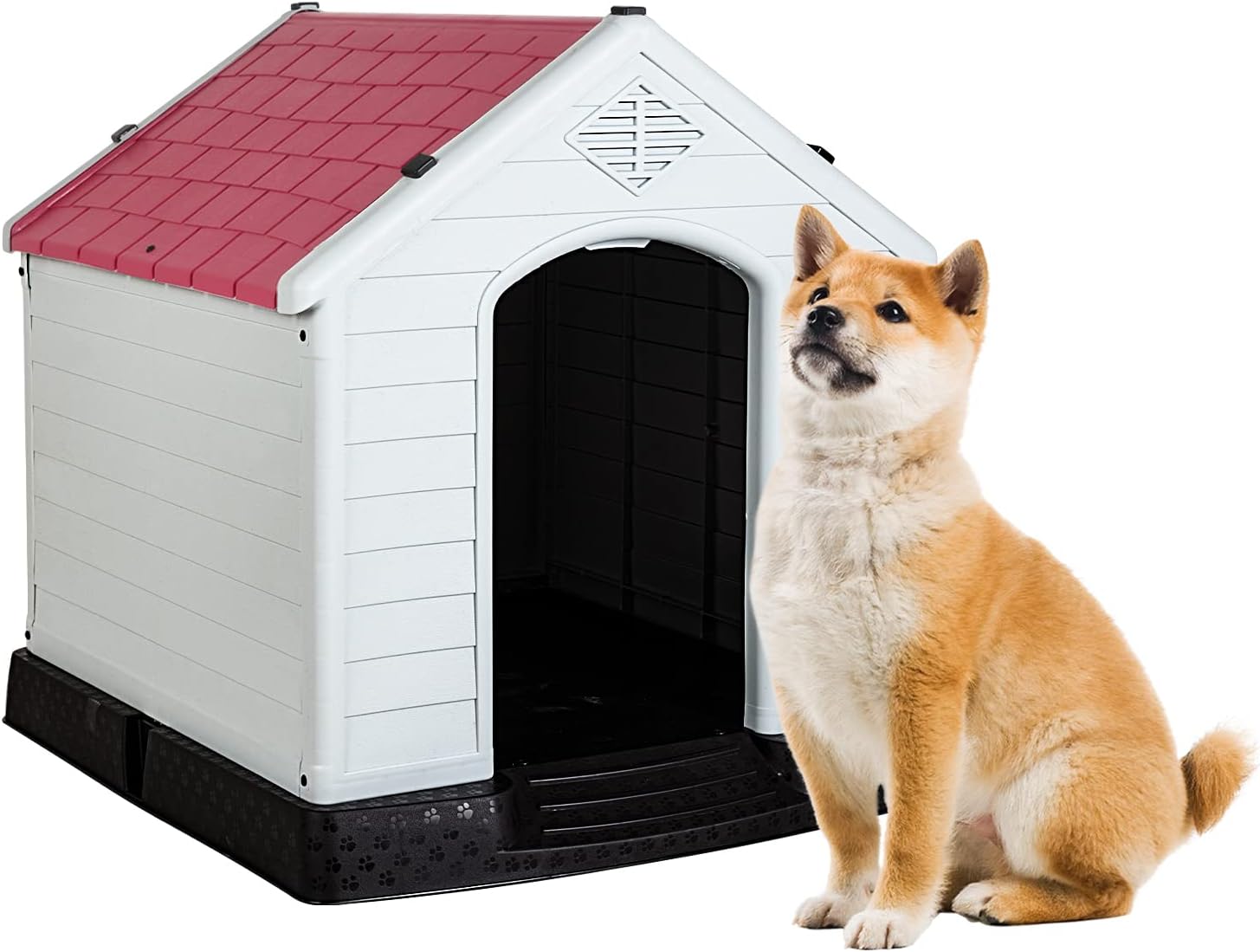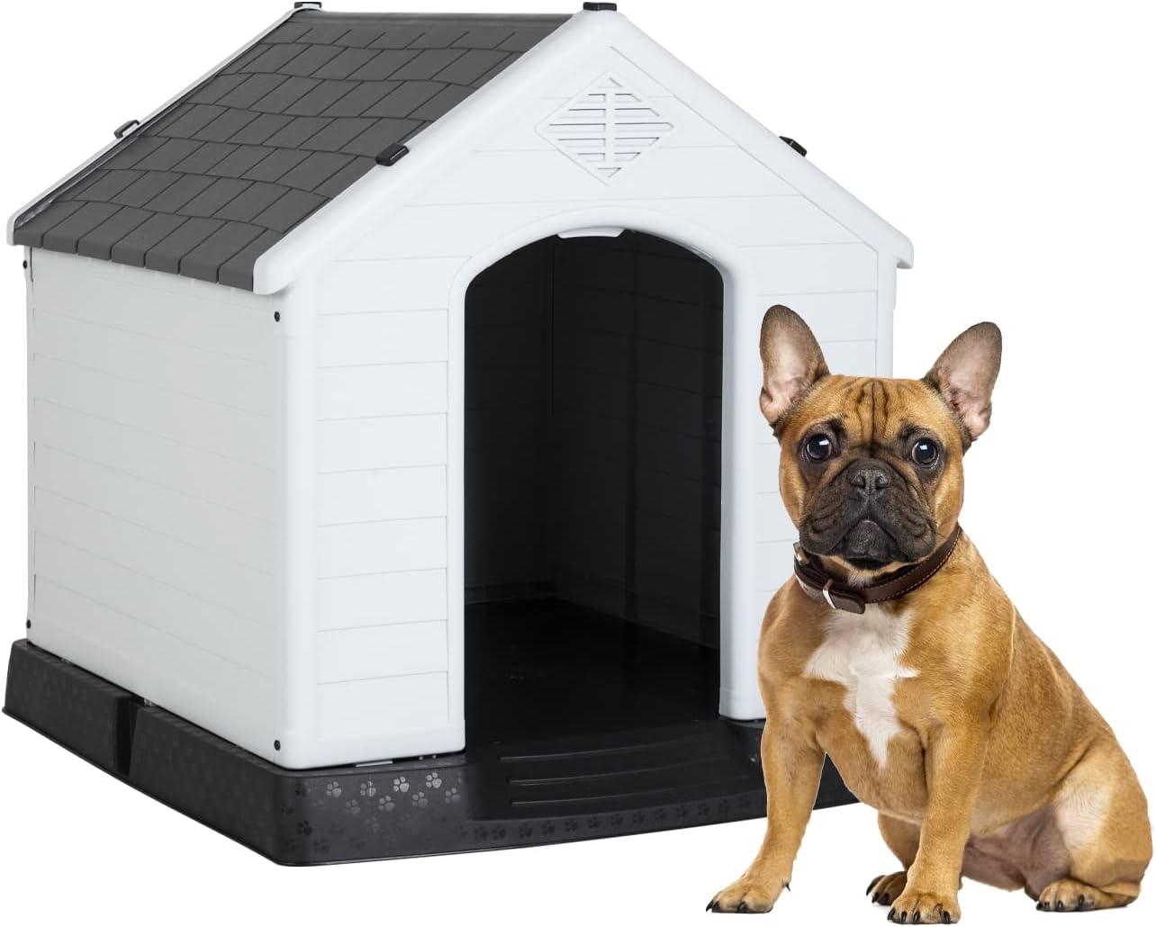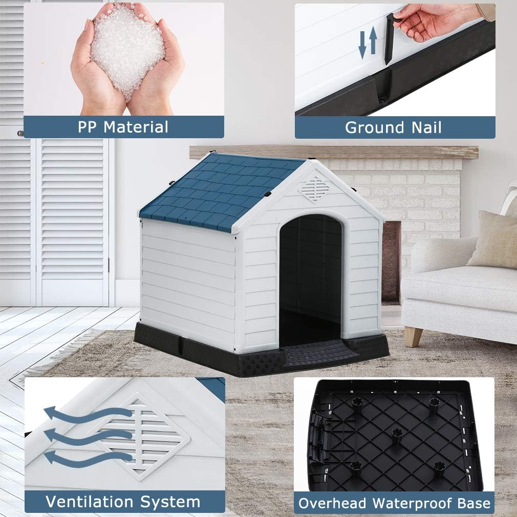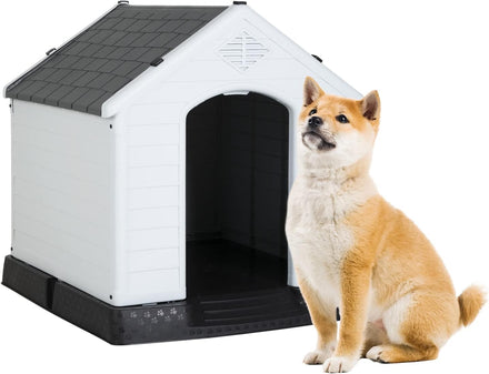 - 🏠【Outdoor Dog House】Our plastic dog house is ideal for use in backyard, patio, deck, etc. Double air vents ensures the circulation of fresh air, keeps your dog cool in summer. Besides, our dog house is made of heat-insulating materials; your pet will feel warmer if you put a blanket on the house in winter.Dog House Indoor Outdoor Plastic Dog House