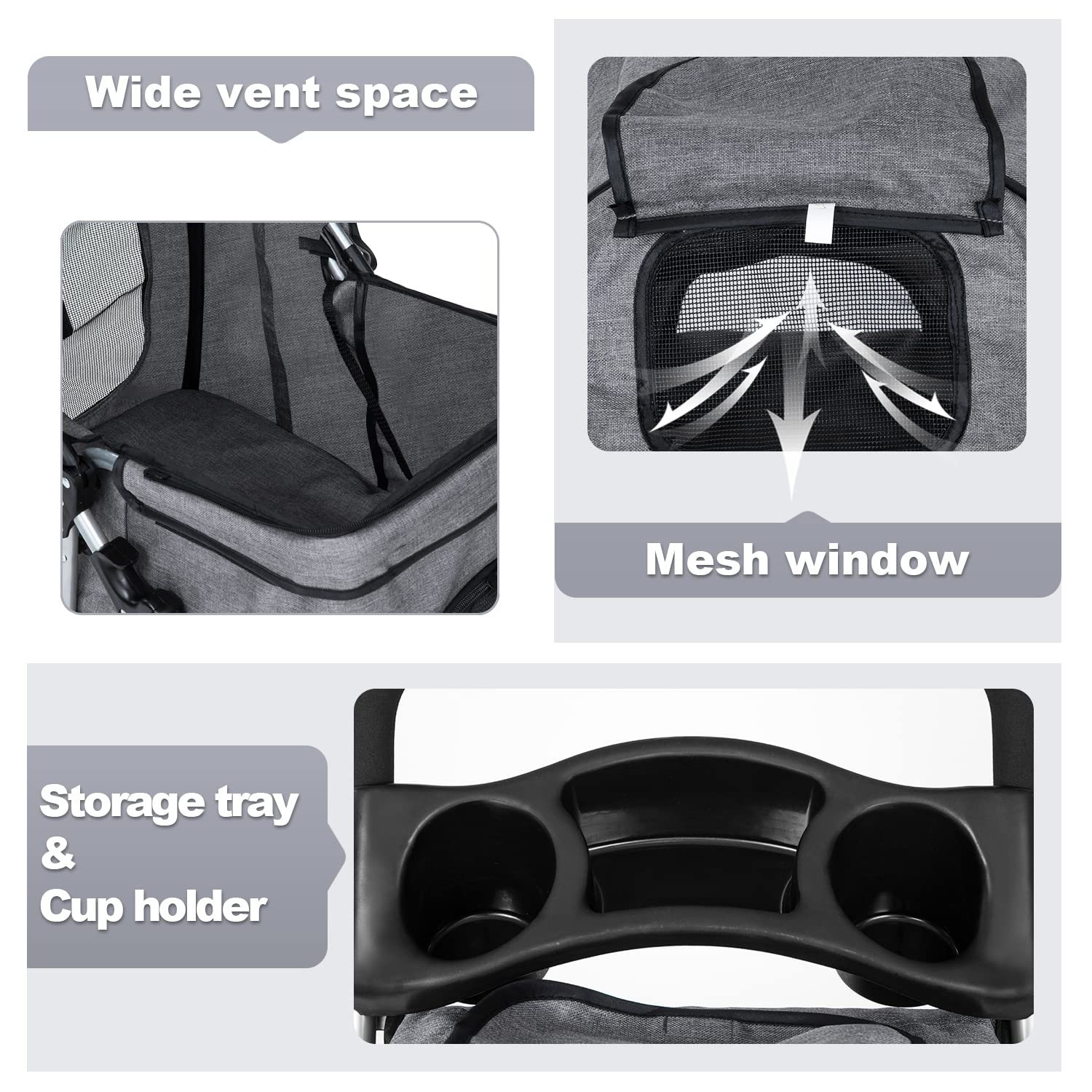 - 🐕【Stroll in Sight】Keeping a close eye on your pets can be easier and each compartment of this pet stroller features zippered mesh screen windows for easy zip and go. On top of watching out for your pet, our jogger stroller also provides the proper ventilation for small animals. And our pet carrier perfect for a wonderful day out! jogger stroller pet carrier pet stroller