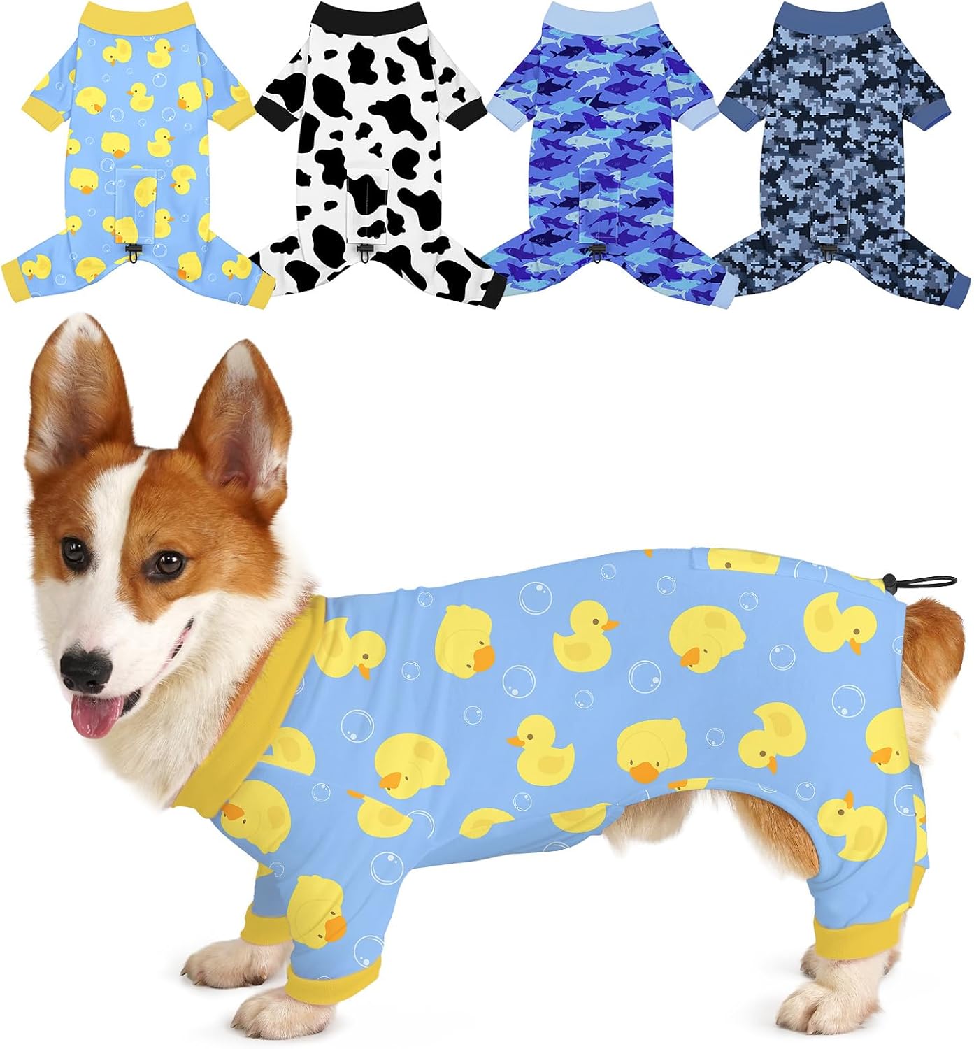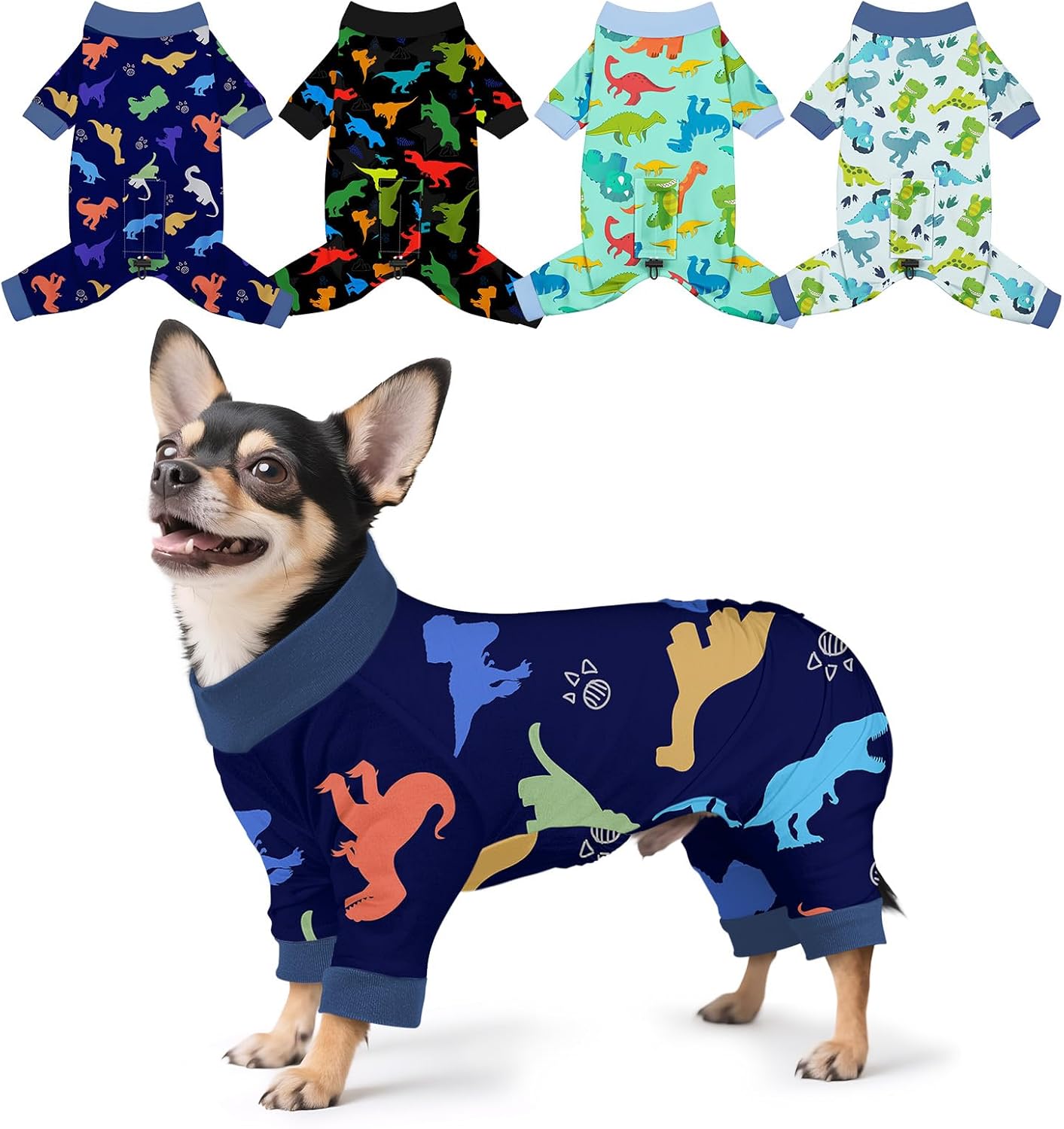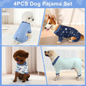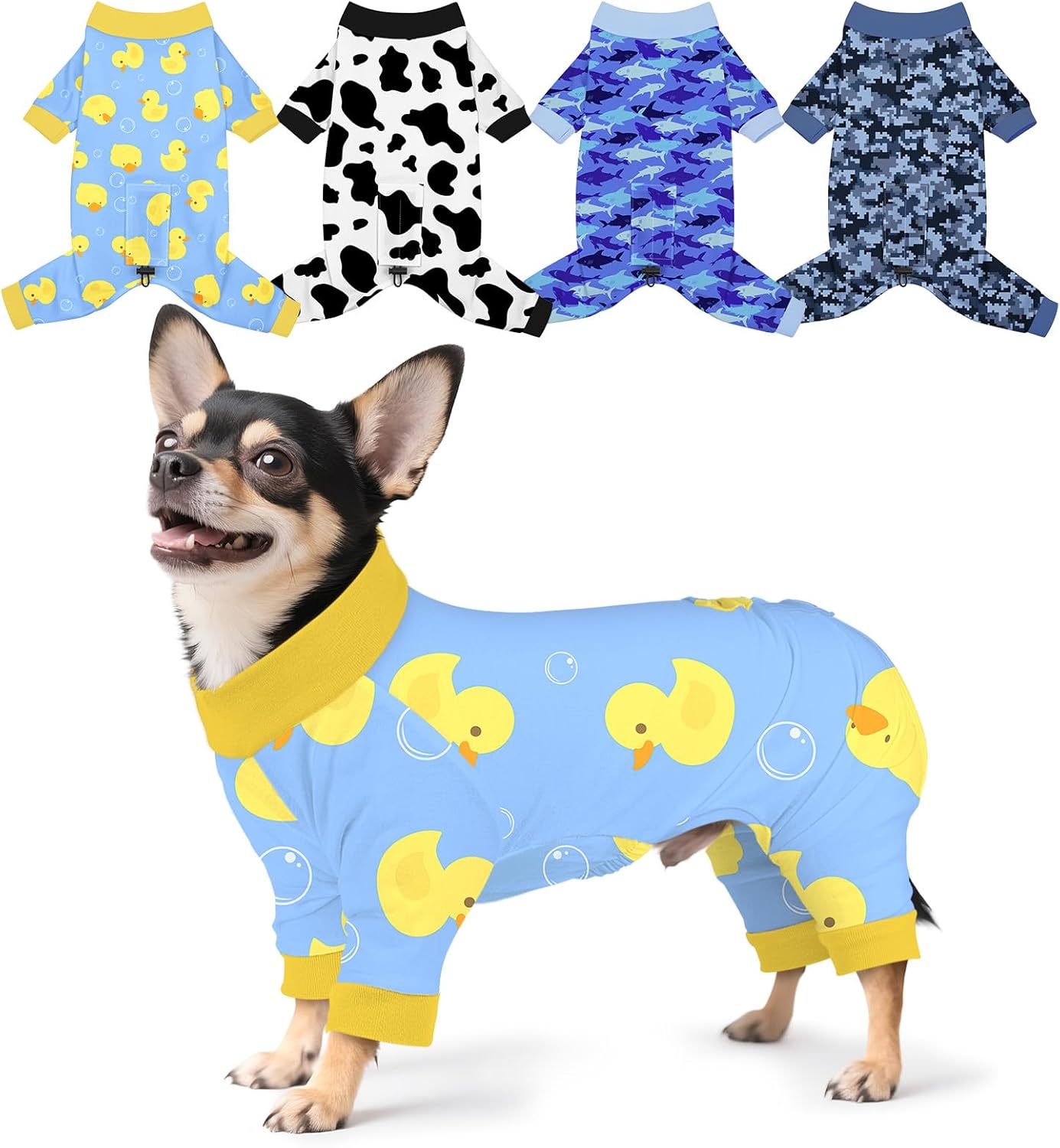 - Bright Patterns:The 4 pieces of dog pajamas have different theme patterns for male and female dogs, such as butterfly, dinosaurs, love-heart,duck,shark and other cute cartoon patterns;The pattern is brightly colored, which makes your dog look more charming in these dog pajamas;it is also very suitable for daily play and photo shooting