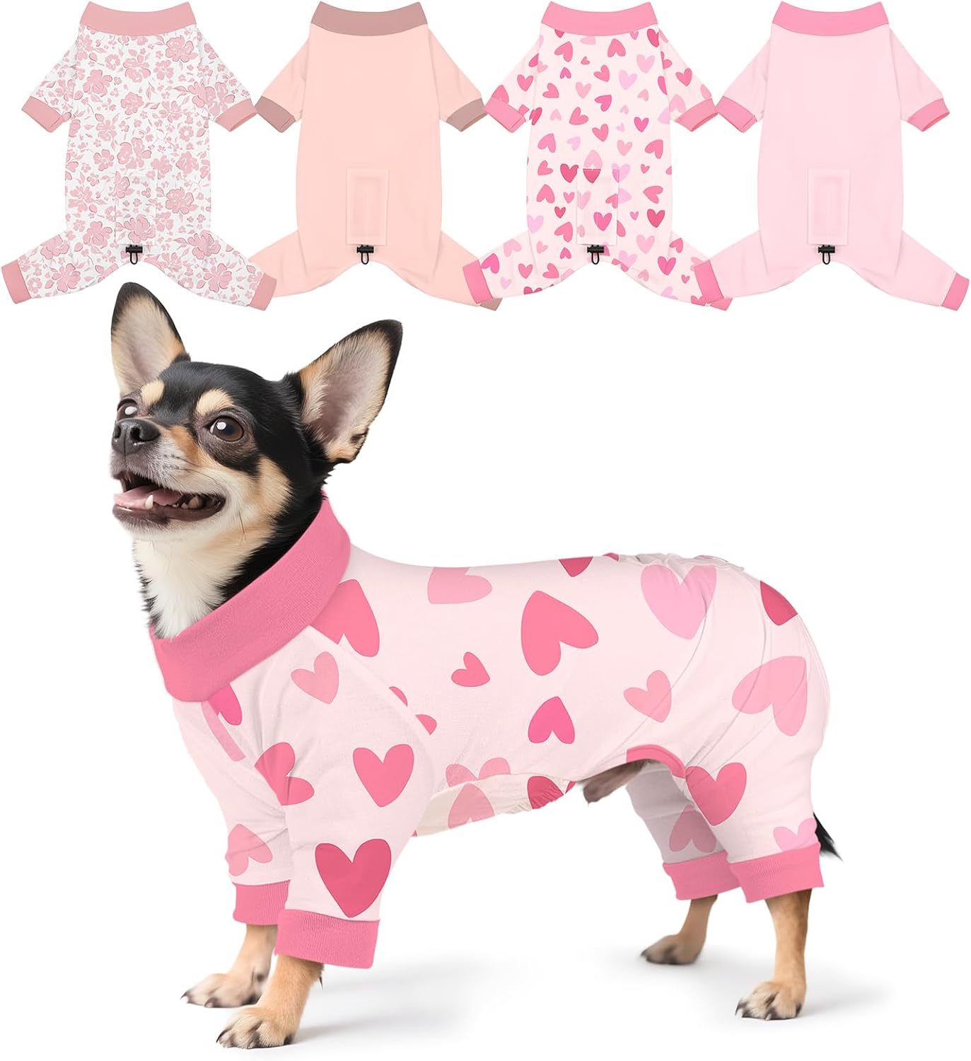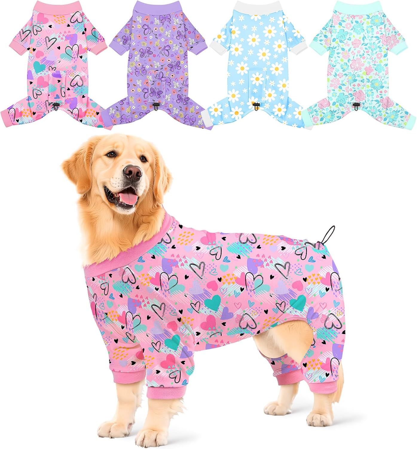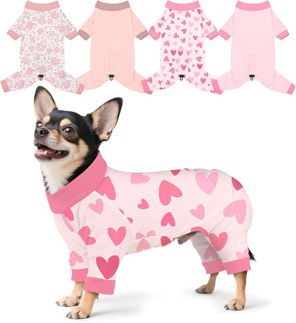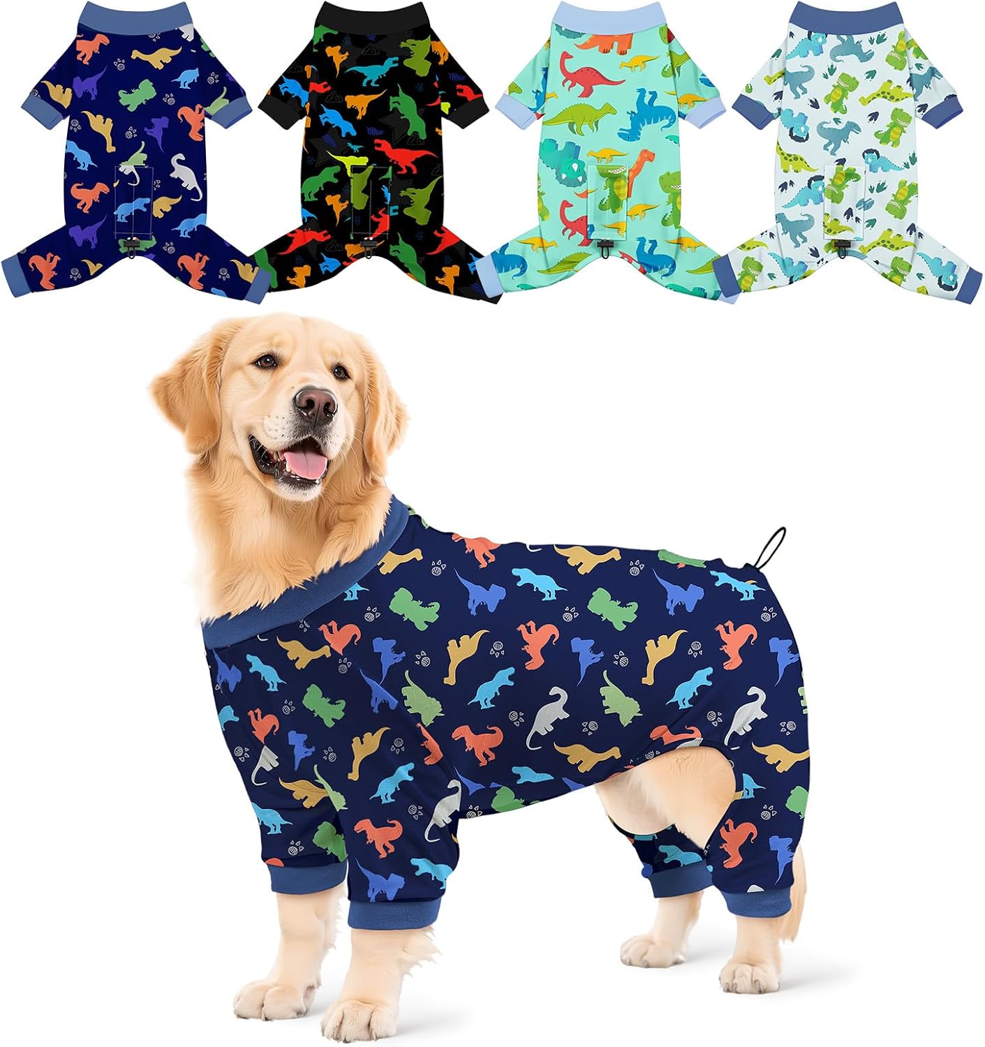 - Bright Patterns:The 4 pieces of dog pajamas have different theme patterns for male and female dogs, such as butterfly, dinosaurs, love-heart,duck,shark and other cute cartoon patterns;The pattern is brightly colored, which makes your dog look more charming in these dog pajamas;it is also very suitable for daily play and photo shooting