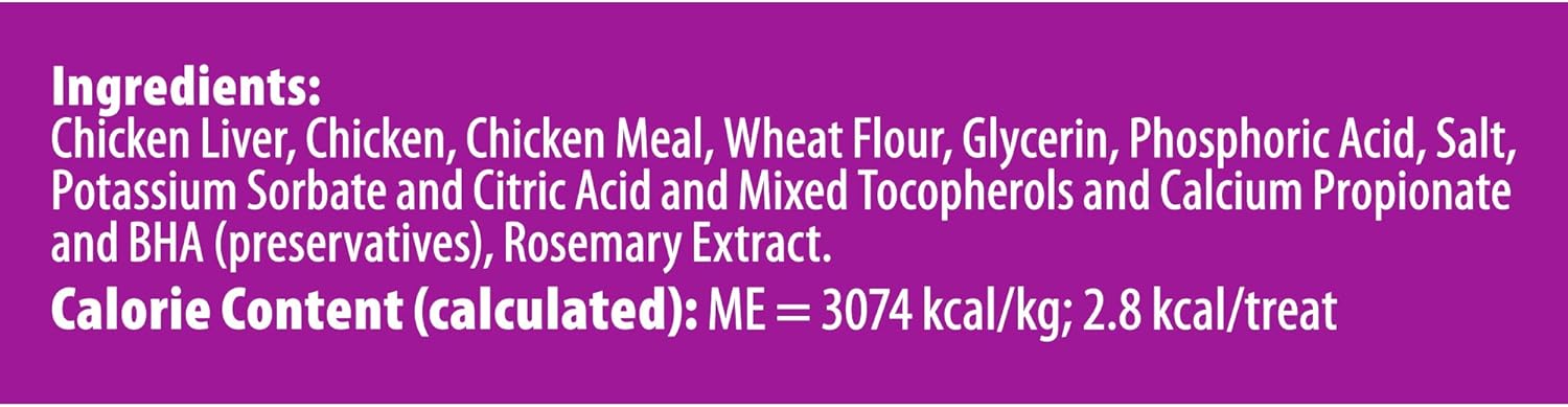 - WHOLESOME INGREDIENTS: The ingredients include Chicken Liver, Chicken, Chicken Meal, Wheat Flour, Glycerin, Phosphoric Acid, Salt, Potassium Sorbate, Citric Acid, Mixed Tocopherols, Calcium Propionate, BHA (preservatives), and Rosemary Extract