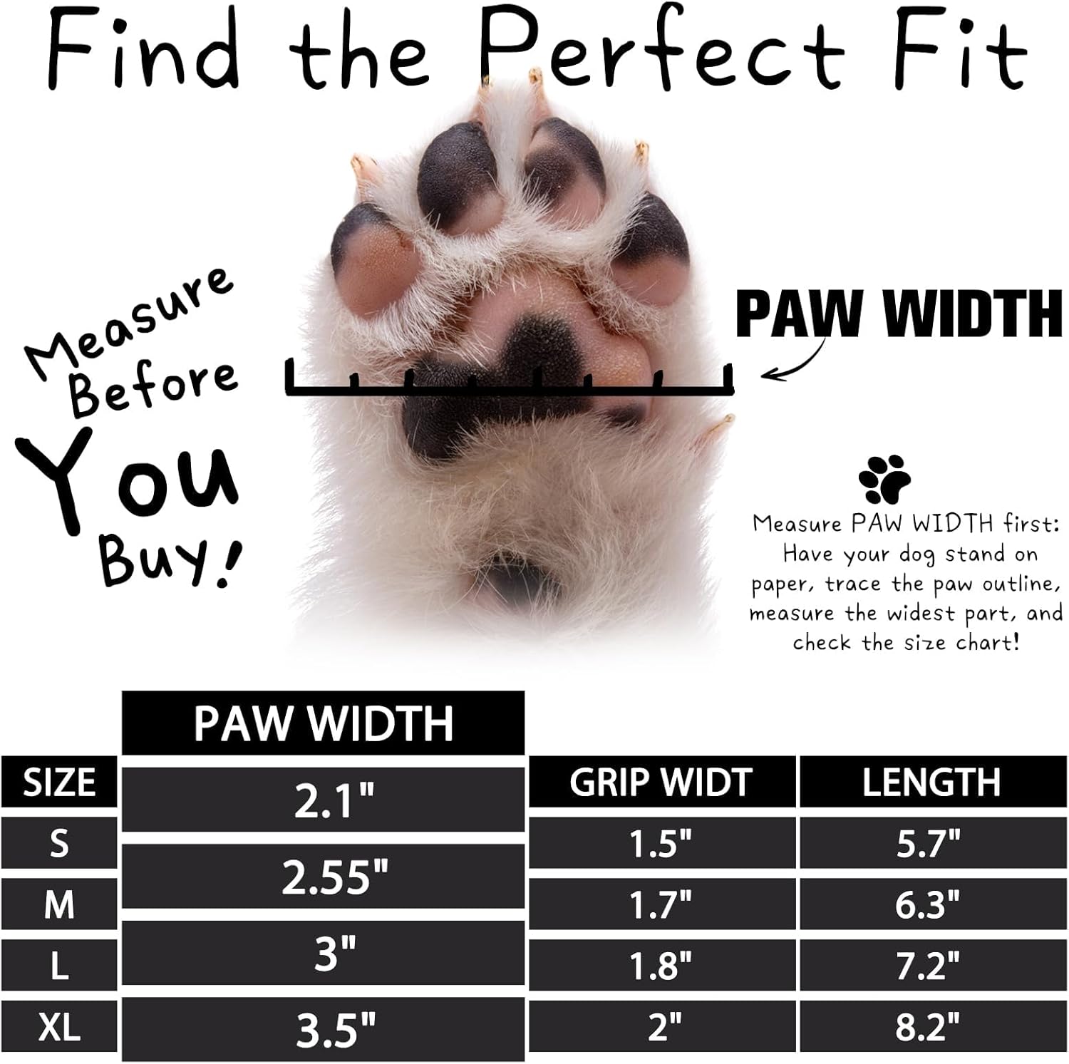 - SIZE MEDIUM: Paw Width – 2.55", Length – 6.3", Grip Width – 1.7". Available in multiple sizes to fit most pets. Please measure your pet’s paws before purchasing. If your dog is between sizes, we recommend choosing the smaller size for a snug fit—our dog grip socks are made with stretchable, elastic fabric for comfort and flexibility
