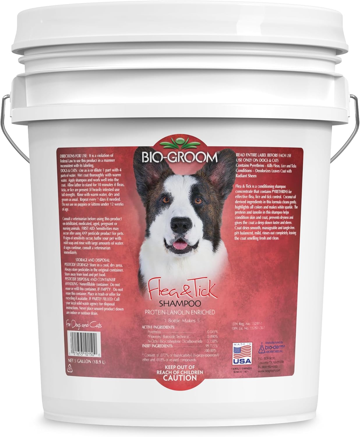 Bio-Groom Flea & Tick Dog Shampoo is available in 12oz, 32oz, 1 gallon, 2.5 gallon, and 5 gallon containers.