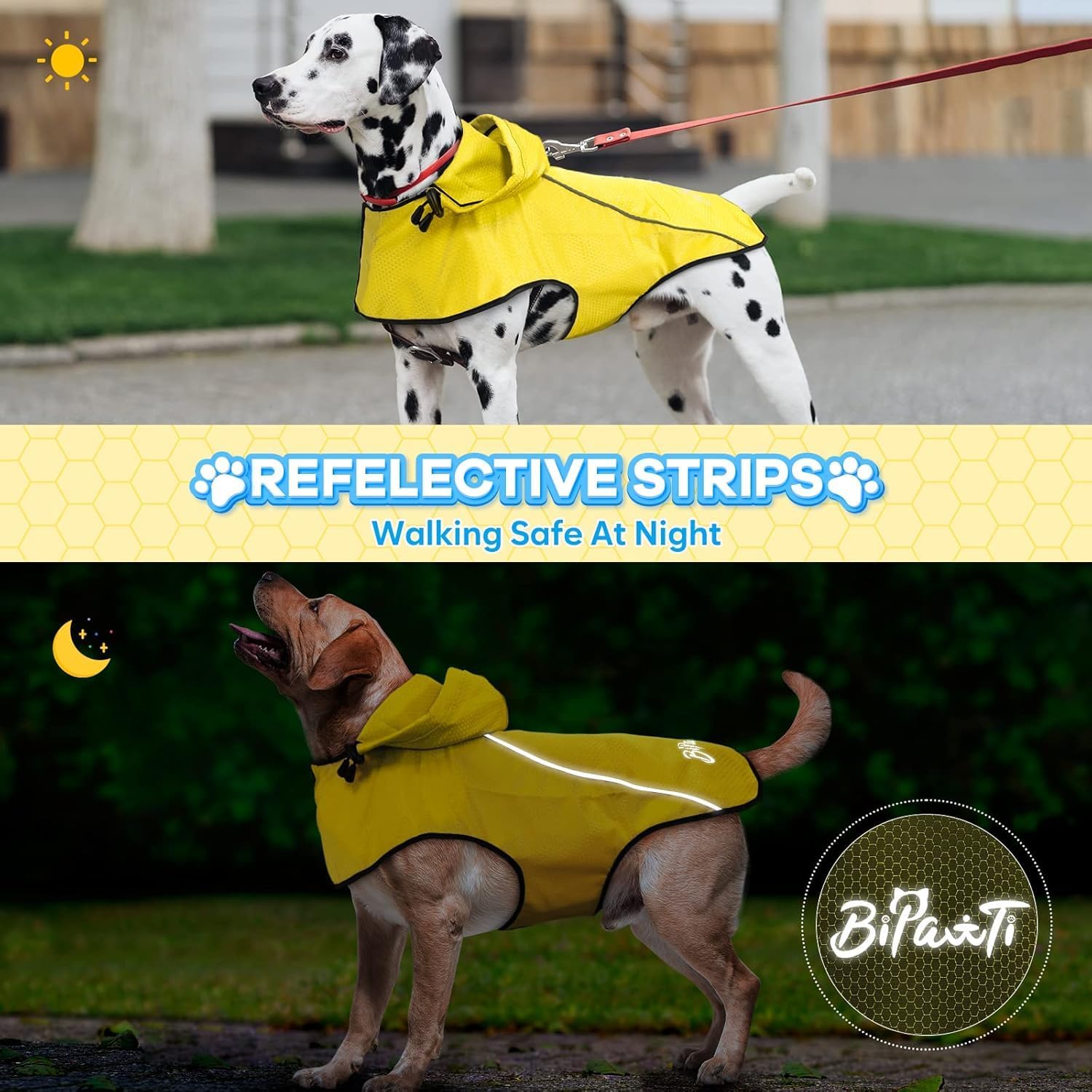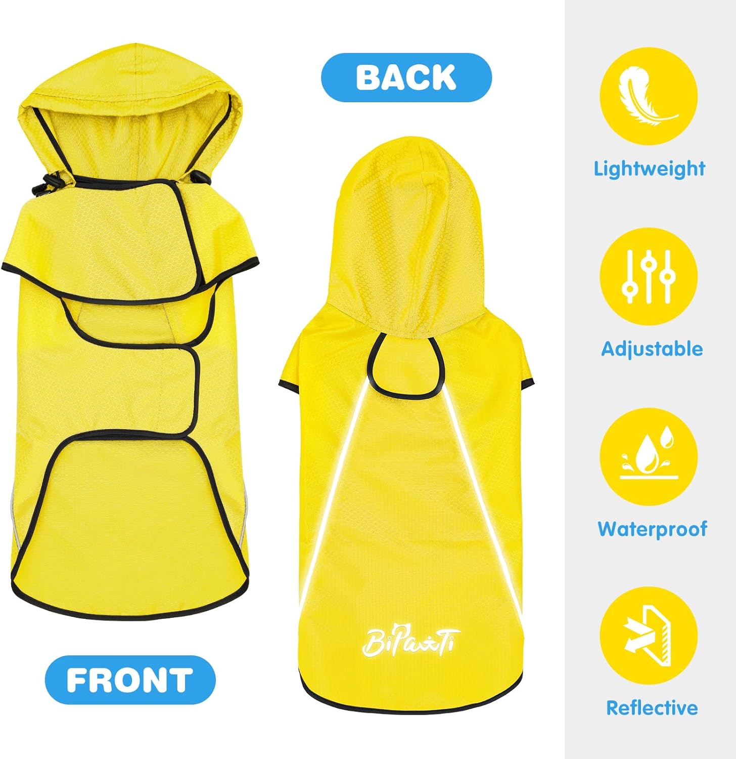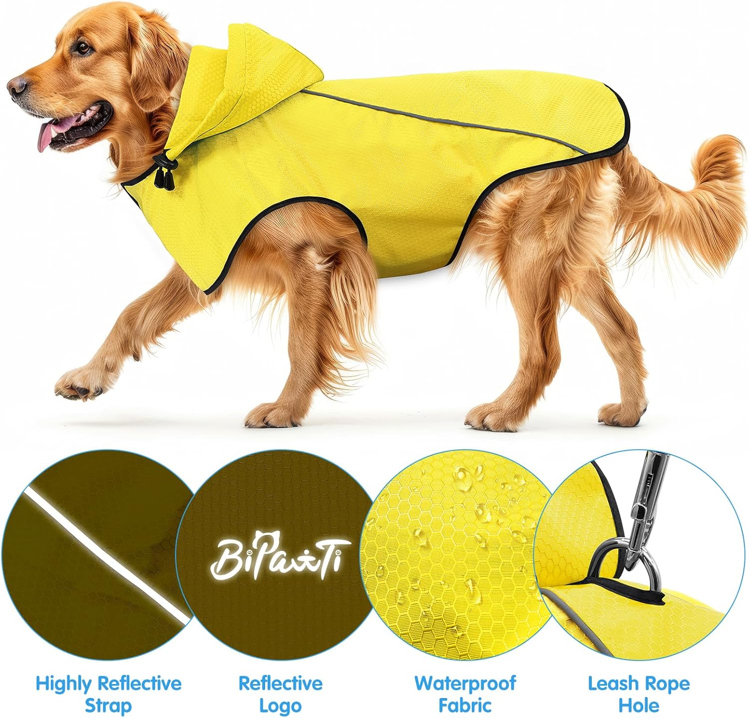 【Reflective Dog Raincoat with Leash Hole】BiPawTi dog rain coat is with reflective strips which can easily spot your dog in the dark environment (nights, early morning), adding more security and prevent accidents, while the leash hole allows you walk the dog easily.