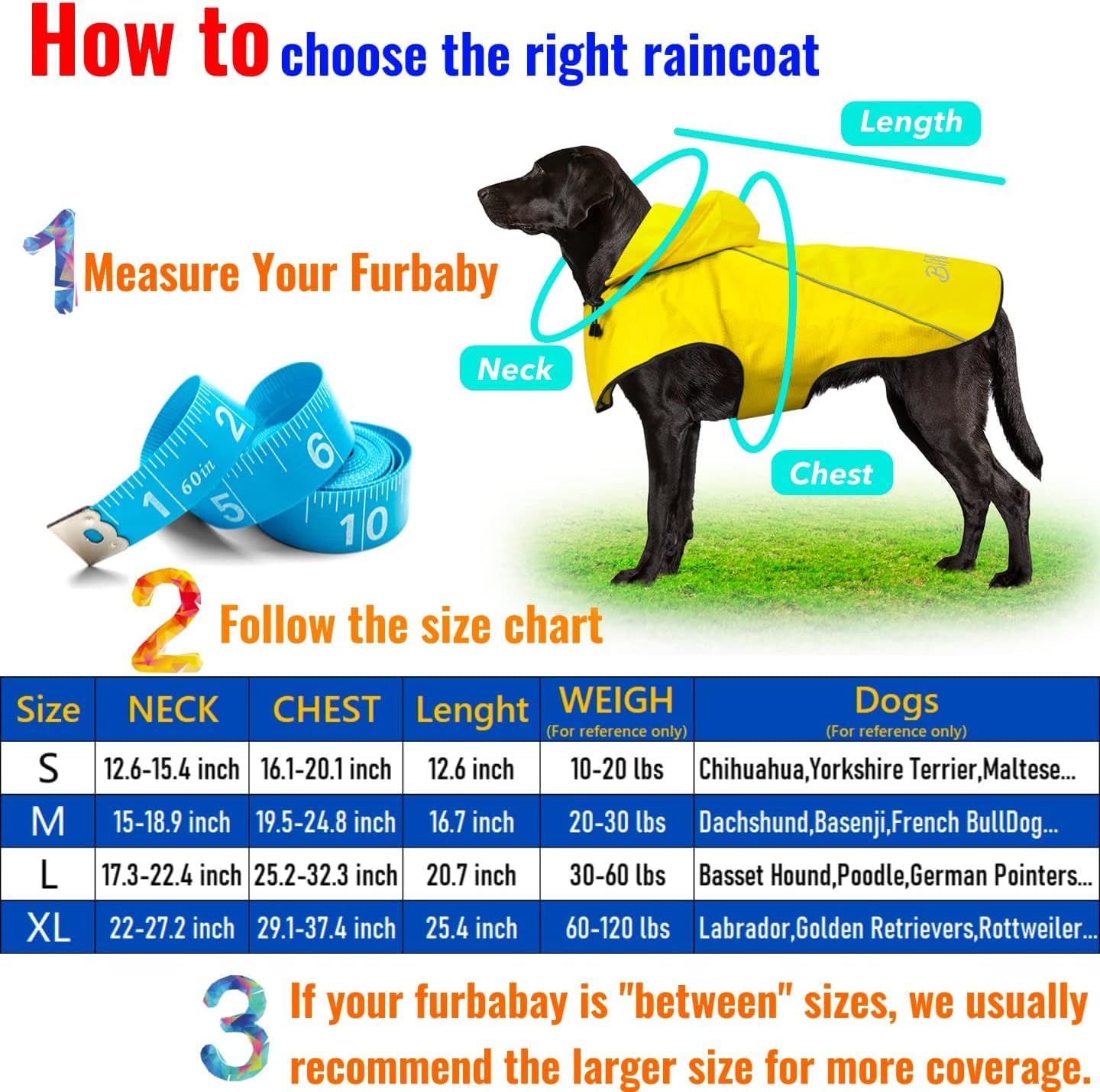 【M Size】Neck Girth is 15-18.9", Chest Girth is 19.5-24.8", Back Length is 16.7". Perfect dog raincoats for mideum dogs, fits well for Bulldog, Beagle, Poodle, Welsh Corgi, etc. NOTE: Please measure your dog carefully and refer to the size chart before purchasing.