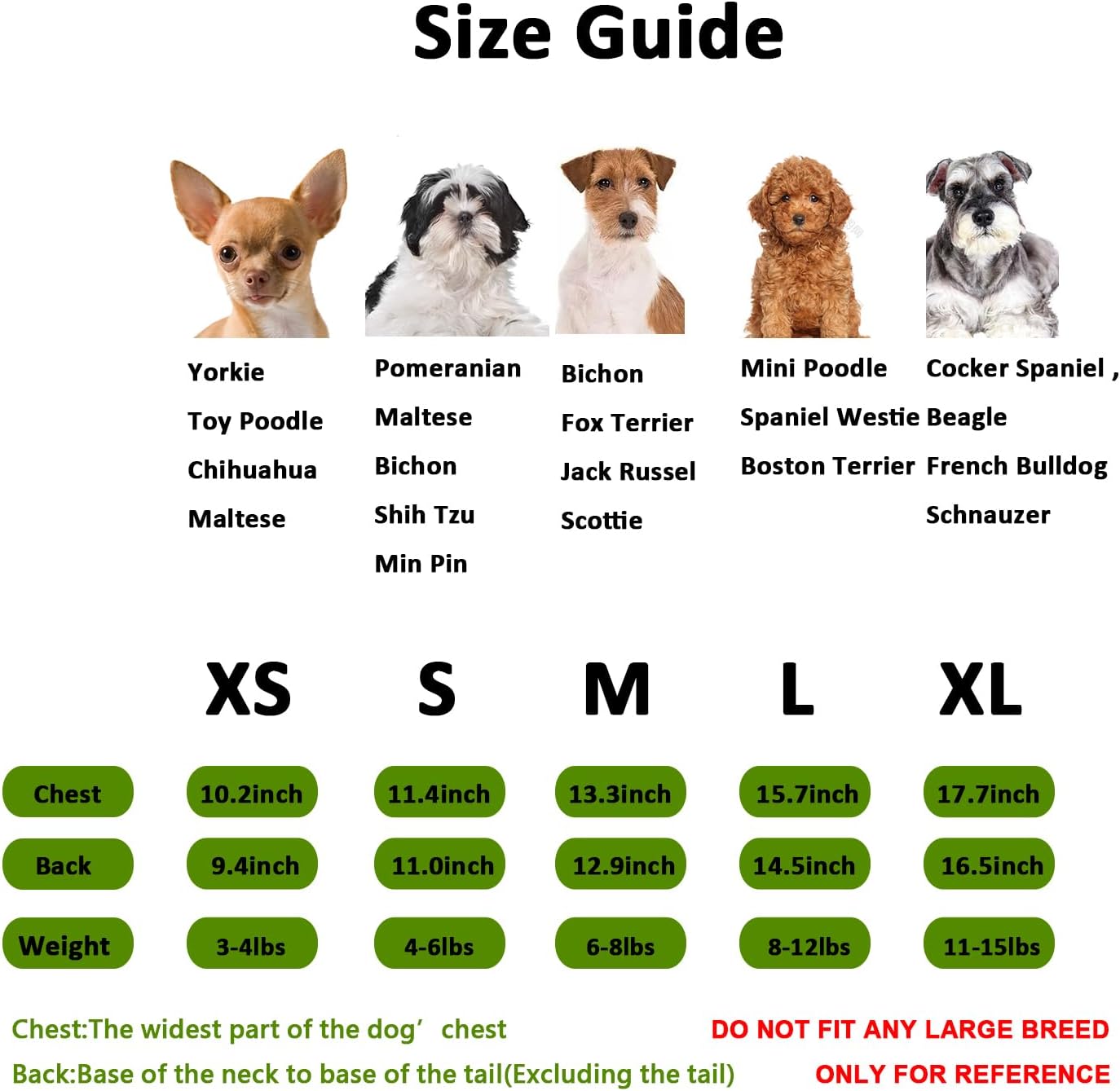 Size Guide:This size is only suit for small dog10-15lbs.Size XL Bust 17.7inch Back 16.5inch.Only suitable for small pet cats and dogs, Please don't choose size according to a usual size, but to measure your pet's chest girth and back length. Your pet usually wears a size S doesn't mean all sizes S fit her.