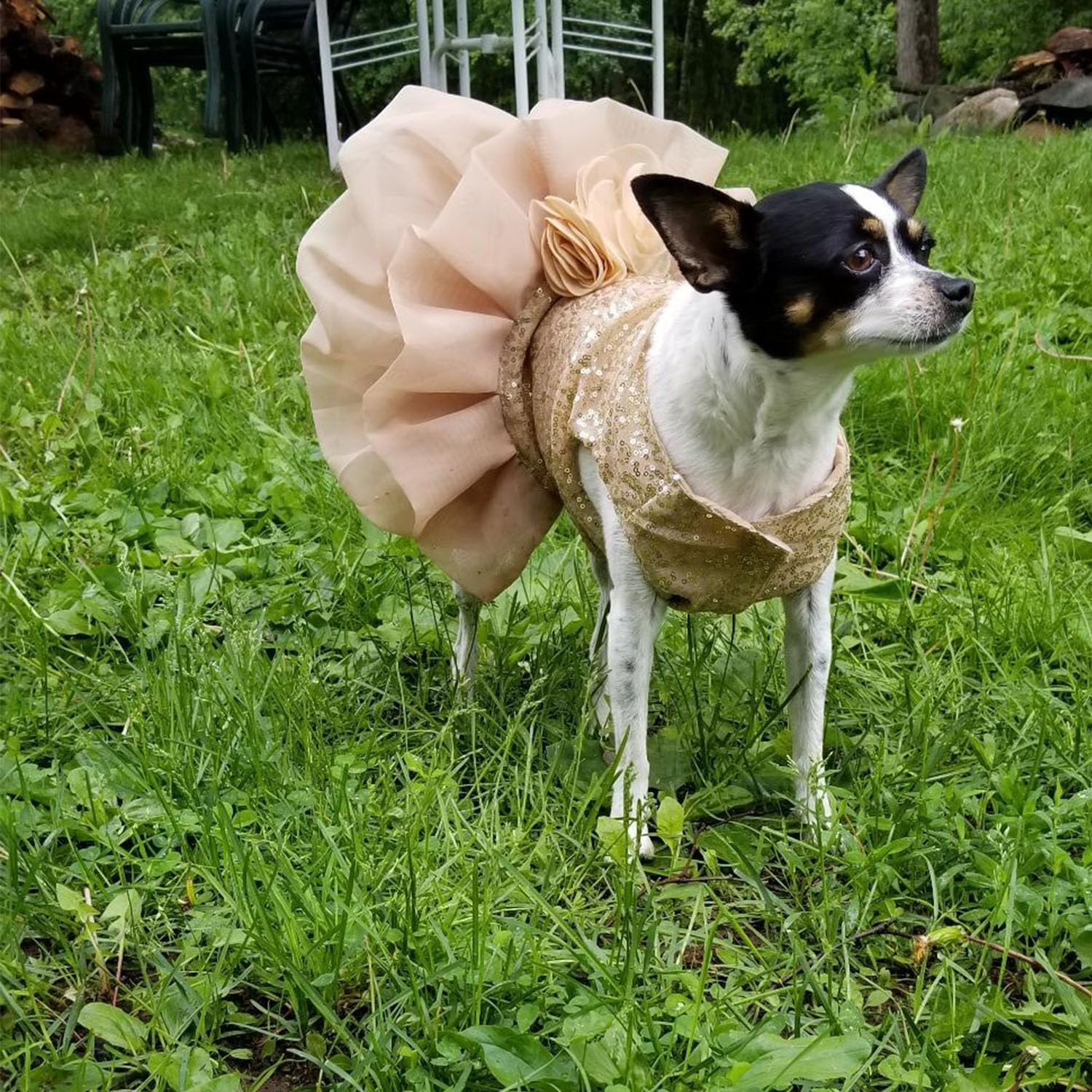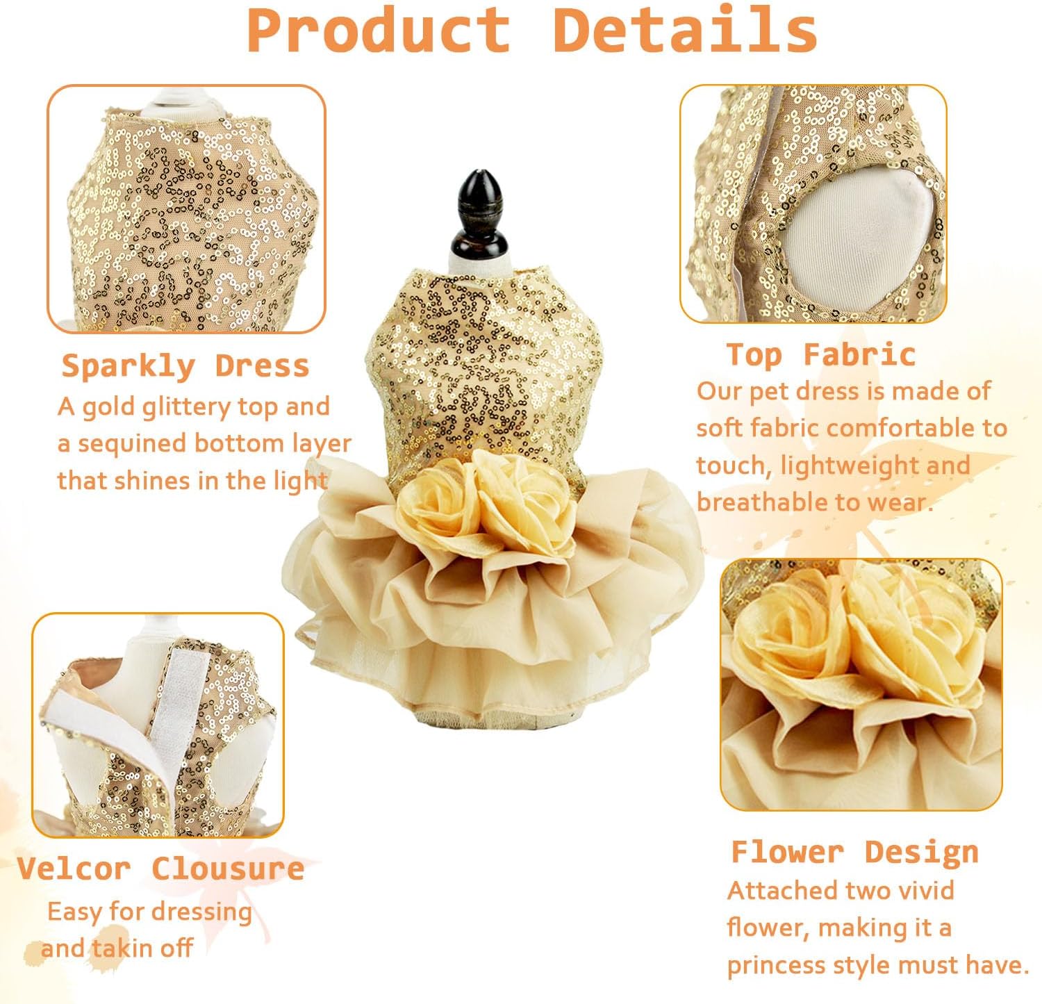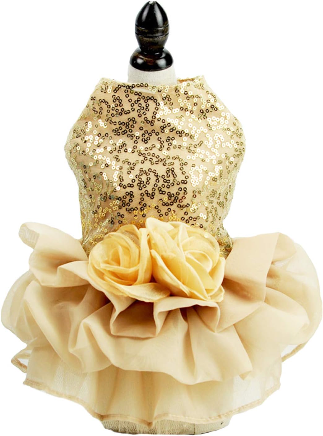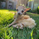 Dog Formal Dress:Small dog princess formal dress, shiny sequin designs, matches flowers on the back. And the wedding style dress turns your pet into a beautiful bride and lets your lovely pet shining and charming.