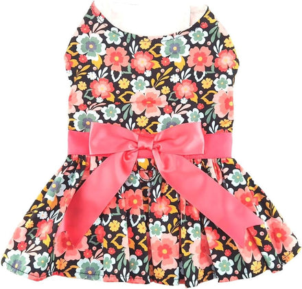 We think this floral dog dress is peachy keen! Blue and peach flowers cover this adorable dog dress. A peach waistband and matching bow complete the cuteness. Comes with a matching leash. Size X-Small through Large offers a D-ring. Size X-Large has a leash hole. Outer dress is 100% cotton, lining is 90% polyester & 10% cotton.