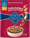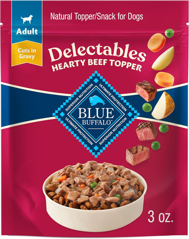 Make mealtime extra special with BLUE Delectables natural wet dog food toppers. This dog food variety pack features two irresistible flavors: Tasty Chicken and Hearty Beef. Featuring tender cuts of real chicken or beef with garden vegetables in gravy, these grain-free dog food recipes come in single-serve pouches that are easy to open and perfectly portioned. And like all Blue Buffalo dog food recipes, BLUE Delectables are formulated with no chicken (or poultry) by-product meals, no corn, wheat, or soy, and no artificial flavors or preservatives. Serve BLUE Delectables as a delicious topper over dry food or as a tasty treat between meals.
