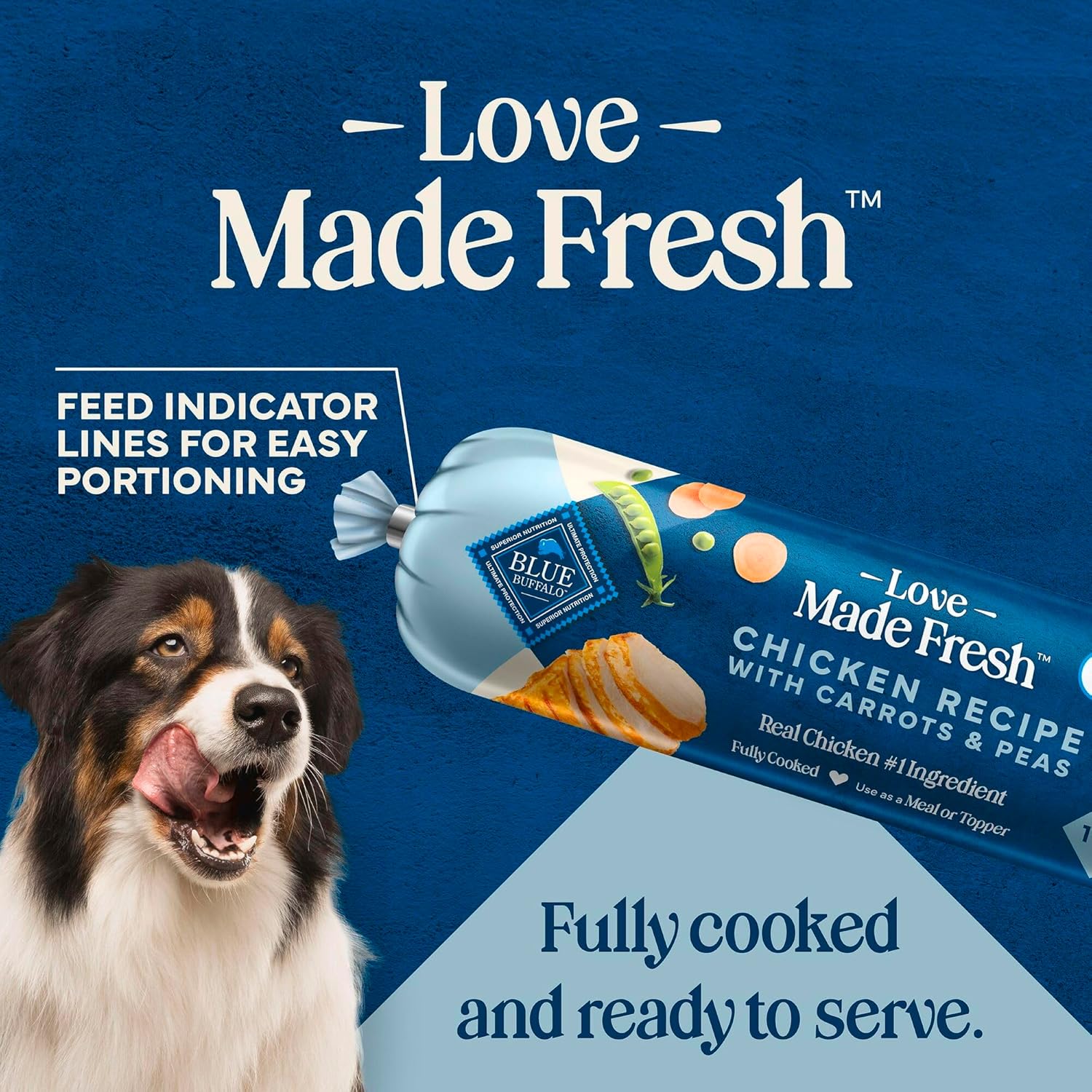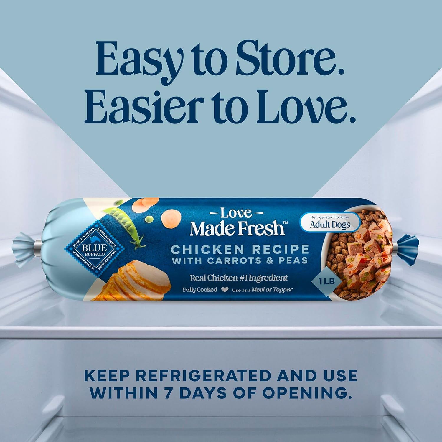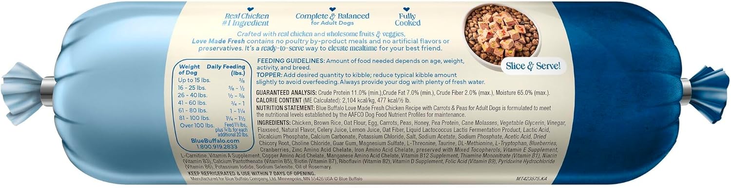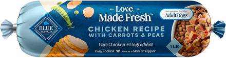 - Contains: One (1) 1-lb roll of BLUE Love Made Fresh Adult Dog Food, Chicken Recipe with Carrots and Peas