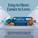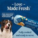 Give your dog the fresh, nutritious mealtime experience they deserve with the first fresh dog food from Blue Buffalo. BLUE Love Made Fresh Chicken Recipe is made with real, savory chicken as the first ingredient, plus wholesome fruits and veggies, to provide your best friend with complete and balanced nutri tion. Make your dog's meal and their day when you serve this wet dog food recipe on its own, or as a mixer or topper with their favorite dry dog food. And because BLUE Love Made Fresh is fully cooked, it's ready to serve straight from the fridge. Just slice the roll along the printed feeding indicator lines for easy portioning. Refer to the back of the packaging for feeding guidelines tailored to your pet's weight. Blue Buffalo is the leader in natural pet food, and Pet Parents can feel good knowing that BLUE Love Made Fresh is made with natural ingredients enhanced with vitamins, minerals, and other nutrients. It contains no soy, no chicken or poultry by-product meals, and no artificial flavors or preservatives. It's the next best thing to a home-cooked meal for the dog you feed like family. Elevate mealtime for your best friend with fresh fridge-to-bowl goodness from Blue Buffalo. Storage instructions: Keep refrigerated and use within 7 days of opening.