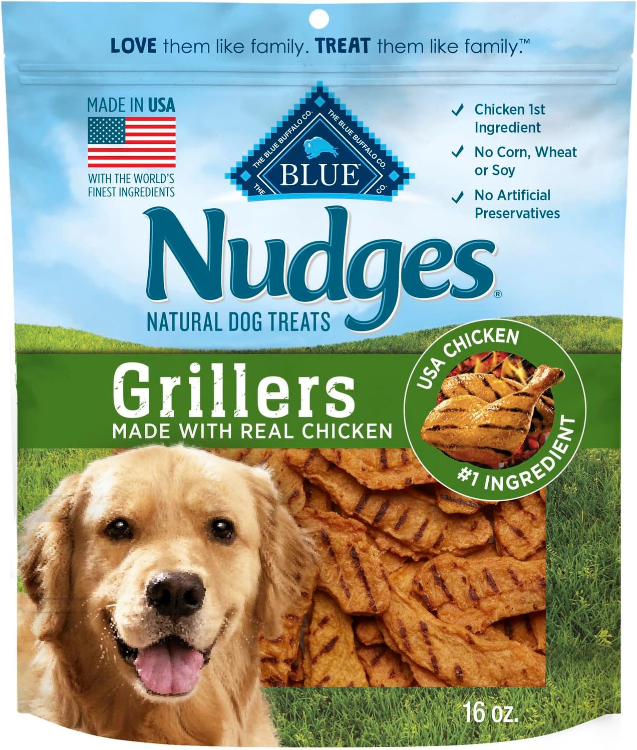 - Contains: One (1) 16-oz bag of Blue Buffalo Nudges Grillers Natural Dog Treats; Chicken Recipe