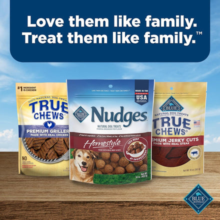 Inspired by delicious comfort foods, BLUE Nudges Homestyle dog treats start with real USA chicken and generous cuts of vegetables to give your dog the mouthwatering taste of a home-cooked meal. They’re a fun way to share the flavors you love with your best bud. BLUE Nudges are brought to you by Blue Buffalo, the leader in natural pet food. Love them like family. Treat them like family. BLUE Nudges are made right here in the USA with all-natural ingredients you’ll feel good about and a taste your dog can’t resist! That’s because, at Blue Buffalo, we use only the best ingredients to make our treats. That means they’re made with real beef, never poultry by-product meals or artificial flavors and preservatives, so you can satisfy your dog’s cravings on the go with a wholesome, healthy reward.