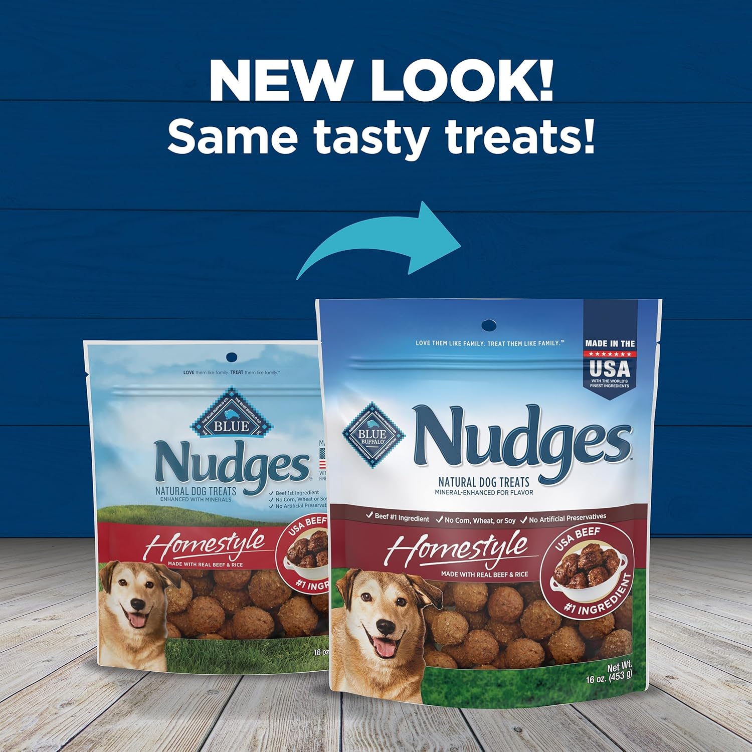 - PACKAGING MAY VARY: Contains One (1) 16oz bag of BLUE Nudges Homestyle Natural Dog Treats, Beef and Rice