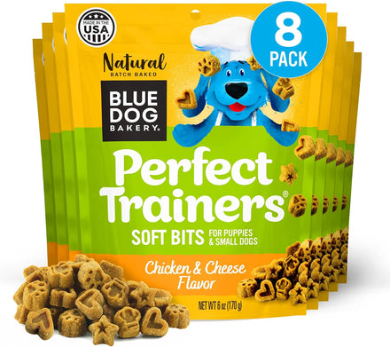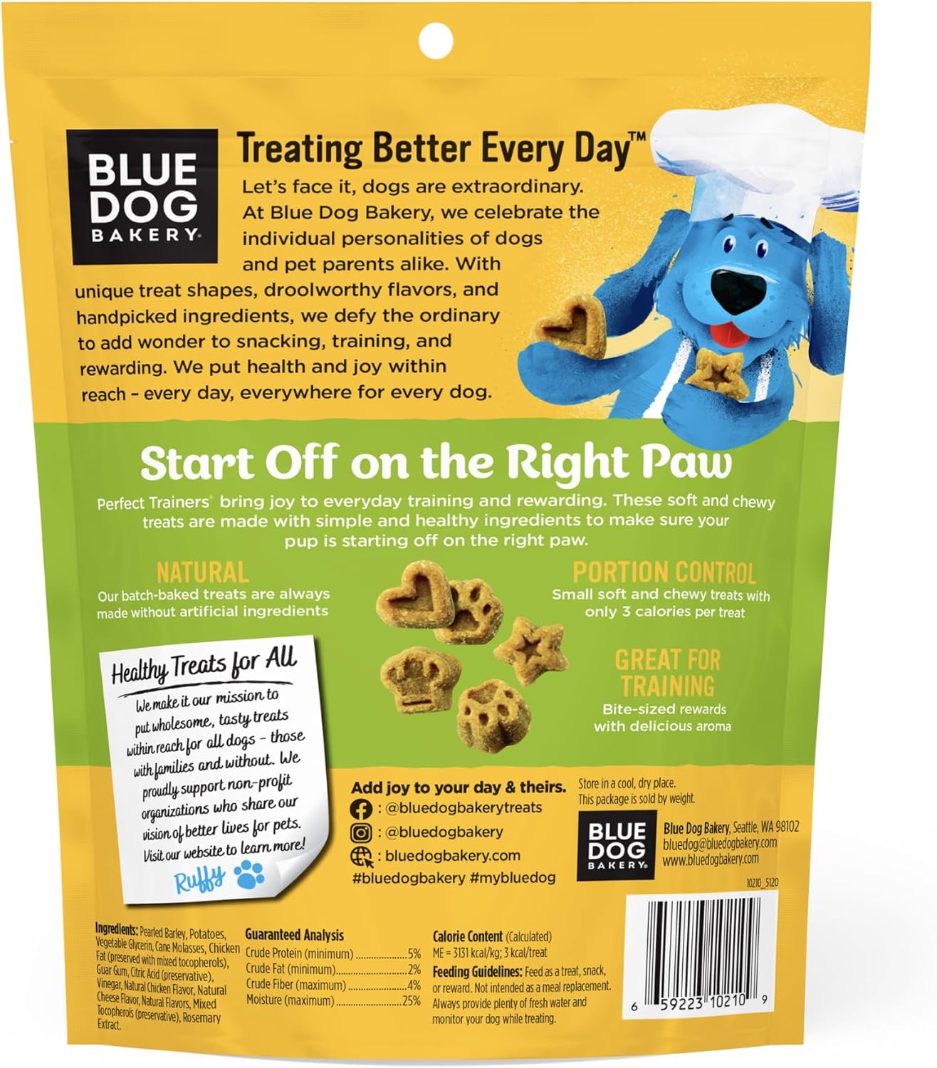 Product Description Perfect Trainers: Great for training! Perfect Trainers have a delicious grilled chicken and cheese flavor that all dogs love! These soft and chewable bite-sized treats make training dogs of any age much easier. A Healthy Dog is a Happy Dog Amazon.com Blue Dog Bakery Perfect Trainers are all natural, soft, and chewy treats. They are bite-sized and ideal for training - or for any dog looking for a little nibble. Perfect Trainers are made without any corn, wheat, or soy, and they make learning new tricks a breeze! We pack them with a resealable zipper to ensure continued freshness. Perfect Trainers: Great for training! Perfect Trainers have a delicious grilled chicken and cheese flavor that all dogs love! These soft and chewable bite-sized treats make training dogs of any age much easier. A Healthy Dog is a Happy Dog. Blue Dog Bakery makes natural treats with the highest quality ingredients to ensure they are safe, wholesome and downright YUMMY! They are baked fresh, with an extra crunch to help support clean teeth and fresh breath. Baked in the USA, with no animal by-products, artificial colors, artificial flavors or preservatives – you can feel good about giving your canine pal these healthy treats that are worthy of the love and devotion you get from them. Blue Dog Bakery proudly supports hundreds of animal rescue and shelter organizations. All Natural Blue Dog Bakery has been using all natural ingredients in its dog treats from the company’s inception in 1998, helping to reshape the pet category in the process. Blue Dog Bakery uses only 100% natural ingredients in their treats with no animal by-products, artificial colors, flavors or preservatives. They also pioneered the mainstream acceptance of functional pet treats containing antioxidants, glucosamine, and condroitin, among other nutritional benefits. Sustainability, Recycling and Managing the Carbon Footprint Blue Dog Bakery prides itself on using only the highest quality ingredients. All of its products are made responsibly in the USA. The palm oil found in all of its treat recipes is sustainably harvested in Colombia, giving them an edge. Not only can you recycle your Blue Dog Bakery treat boxes, they are also made from post-consumer waste recycled materials – which is great for you and for Mother Nature. Blue Dog Bakery works hard to minimize shipping and logistics in order to reduce transportation, and lower its carbon footprint. They recently opened a second warehouse on the east coast to continue its efforts to be the best global citizens possible. About Blue Dog Bakery Since 1998, Blue Dog Bakery has been dedicated to making healthy all-natural treats for dogs. It wasn’t long before their treats caught on and people were asking where they could buy them. Blue Dog Bakery knows that a long and happy life goes "paw-in-paw" with good nutrition, which they always keep in mind when creating new treats. They only use the highest quality ingredients such as whole eggs, nonfat milk and whole wheat making them easily digestible, full of fiber and protein and good for an overall balanced diet. NO animal by-products NO artificial flavors or colors NO artificial preservatives. Just all-natural baked goodness that your dog will love. Take a big whiff next time you open a box. You and your dog will smell the difference! Try all of our great natural treats! Peanut Butter & Molasses MORE Flavors Peanut Butter Doggie Paws Peanut Butter Softies Super Stars Doggie Cremes Bakery Bones Perfect Trainers