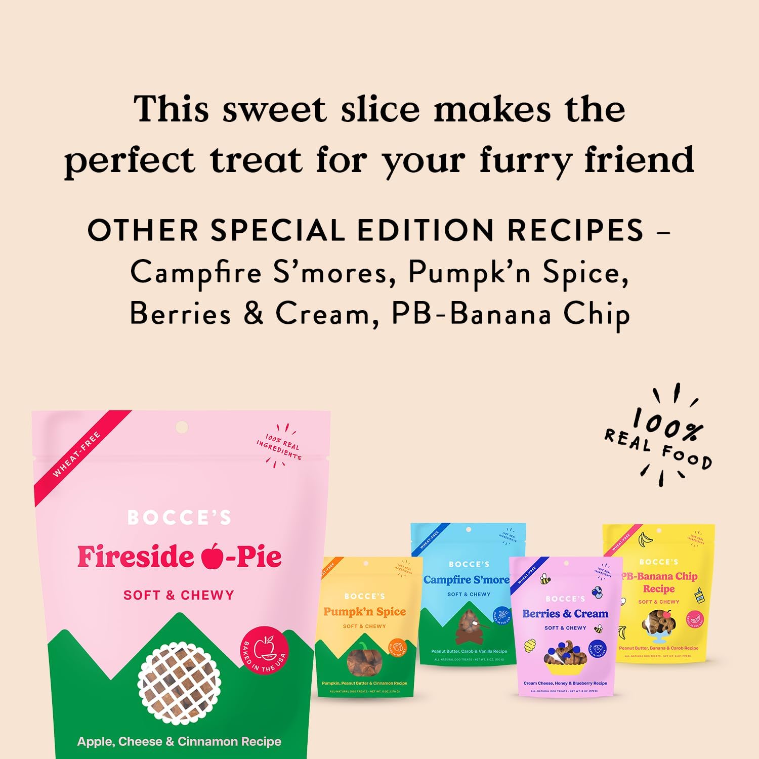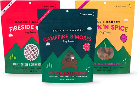 Bocce’s Apple Pie dog treats are a slice of comfort your dog can enjoy! The perfect soft treats for a night by the campfire or snuggling inside. These chewy snacks are made with a wheat-free recipe and 100% real food. Ingredients: Oat Flour, Apples, Rolled Oats, Coconut Glycerin, Cheese, Molasses, Flaxseed, Vegetable Oil, Cinnamon, Citric Acid Bocce’s Bakery started in a tiny West Village kitchen with a mixer, an oven, and a scruffy mutt named Bocce with the belief that dogs deserve better. Better treats with fresher, simpler, all-natural ingredients.