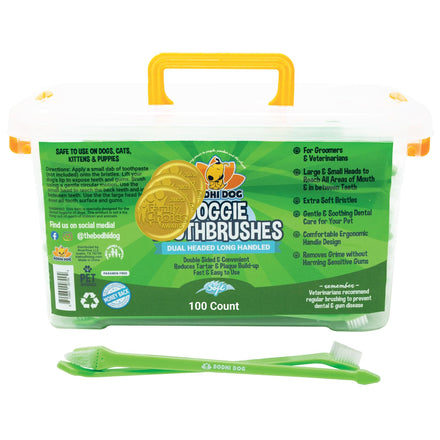 We use premium pet safe materials that offer a safe and professional cleaning for your pet. Our Dual Ended Long Toothbrushes come packaged in a convenient case of 100 offers you a great value and a great start in establishing a daily brushing routine for your pet.