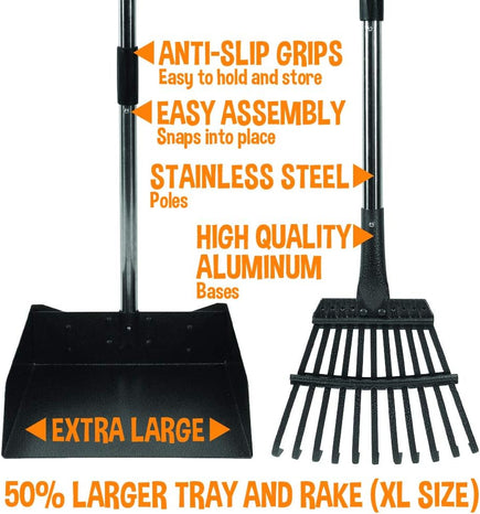 - Quick & Easy Assembly: Clean up after your pet effortlessly with the Bodhi Dog Pooper Scooper for yard Tray & Rake Set. Designed for all dog sizes, it features a durable, interlocking bin and rake with nine teeth to handle any mess. Made with premium materials for lasting use.