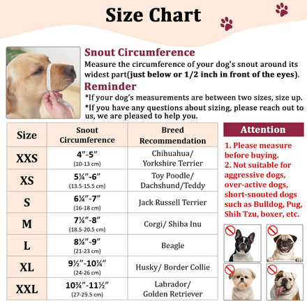 Try to calm your dog down first to get an accurate measurement. Measure around the widest part of your dog’s mouth(with a slight open), one inch below the eye base. If your dog’s measurements fall between two sizes, please choose the large size.