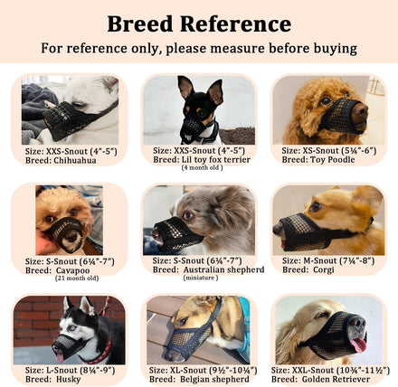 - Múltiples opciones de tamaño: el bozal de malla Mayerzon para perros está disponible en 7 tamaños. El tamaño XXS (adecuado para circunferencias de hocico entre 4 y 5 pulgadas) es perfecto para razas como Chihuahua, Yorkshire Terrier, pero no se recomienda para perros de hocico corto como Shih Tzu, Pit Bull, Boxer, etc.